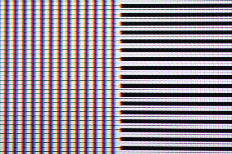 Положительным следствием такой необычной структуры является увеличение углов обзора в горизонтальном направлении, а отрицательным — легкое размытие в пределах размера пикселя также по горизонтали. Для иллюстрации второго приведем увеличенное изображение миры с черными вертикальными (в левой части) и горизонтальными (в правой части) полосками толщиной в один пиксель на белом фоне.