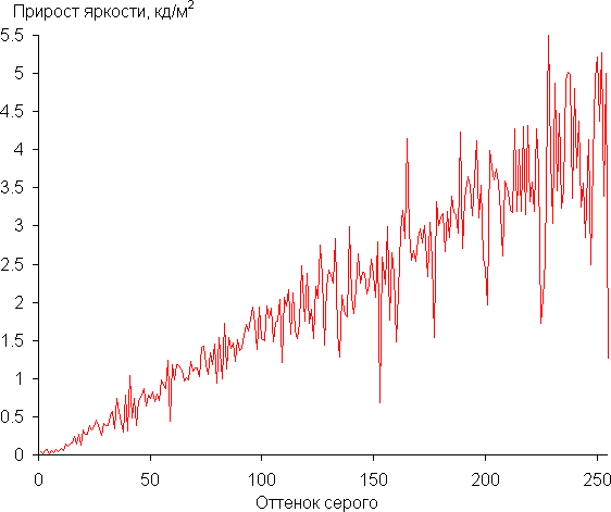 Для оценки характера роста яркости мы измерили яркость 256 оттенков серого (от 0, 0, 0 до 255, 255, 255) при подключении к ПК в режиме RGB при 3840×2160 и 60 Гц, параметр Гамма в настройках ТВ равен 2.2, Контраст = 50. График ниже показывает прирост (не абсолютное значение!) яркости между соседними полутонами:
