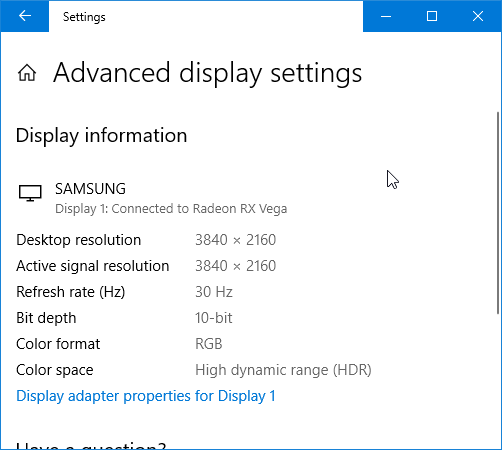Под Windows 10 вывод в режиме HDR на данный телевизор возможен при выборе соответствующих опций в настройках дисплея. При разрешении 4К и 60 Гц вывод идет в режиме 8 бит на цвет, дополненных динамическим смешением цветов, видимо, с помощью видеокарты на аппаратном уровне. При 50 Гц — 10 бит на цвет (динамическое расширение до 10 бит выполняется уже самим ТВ):