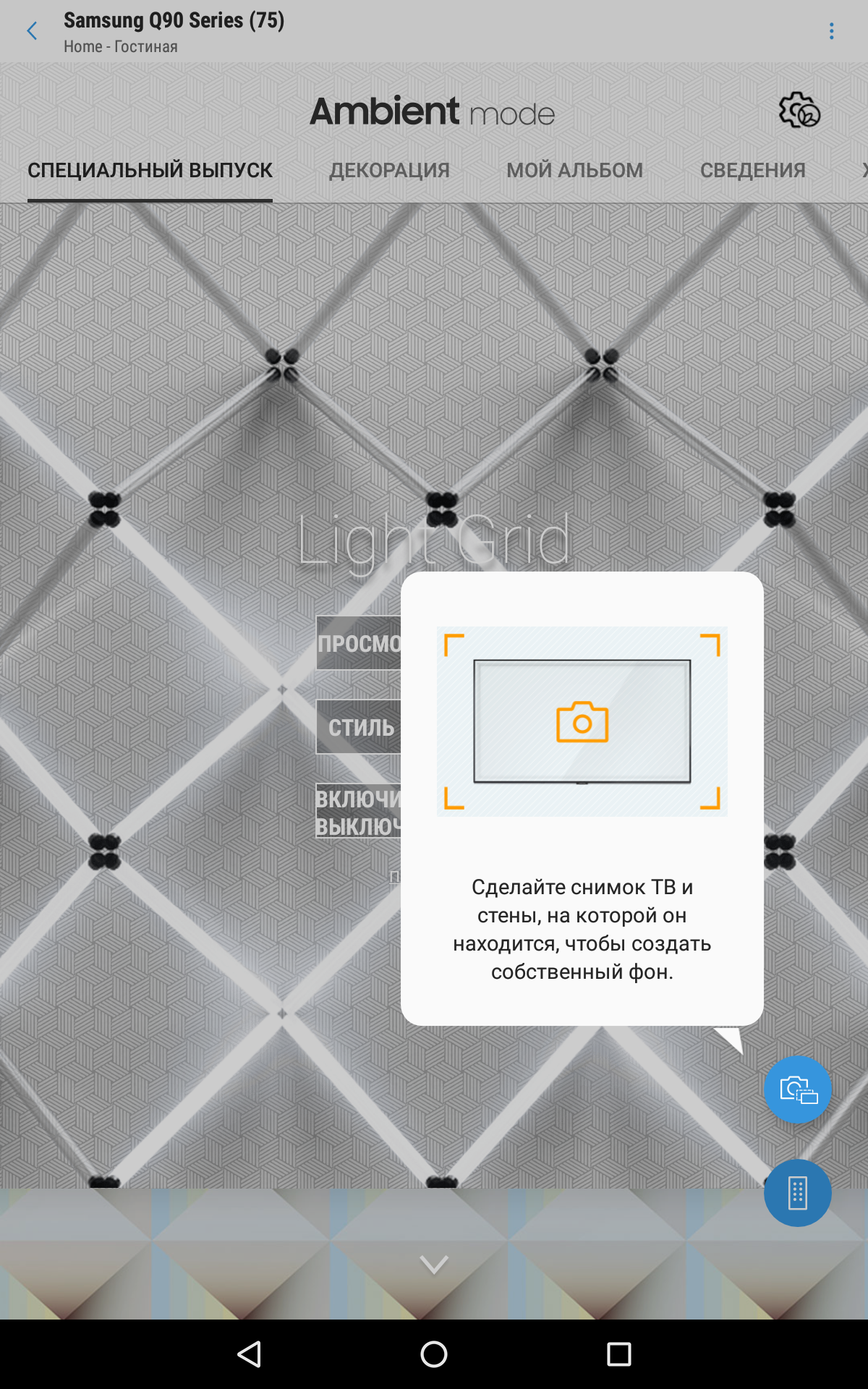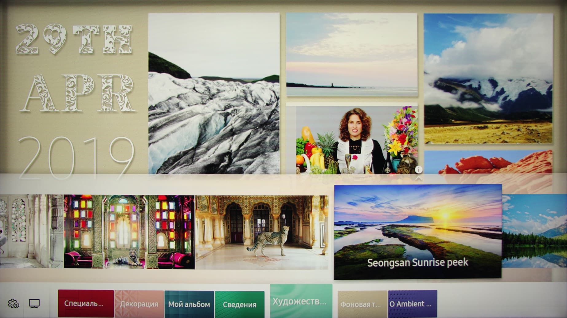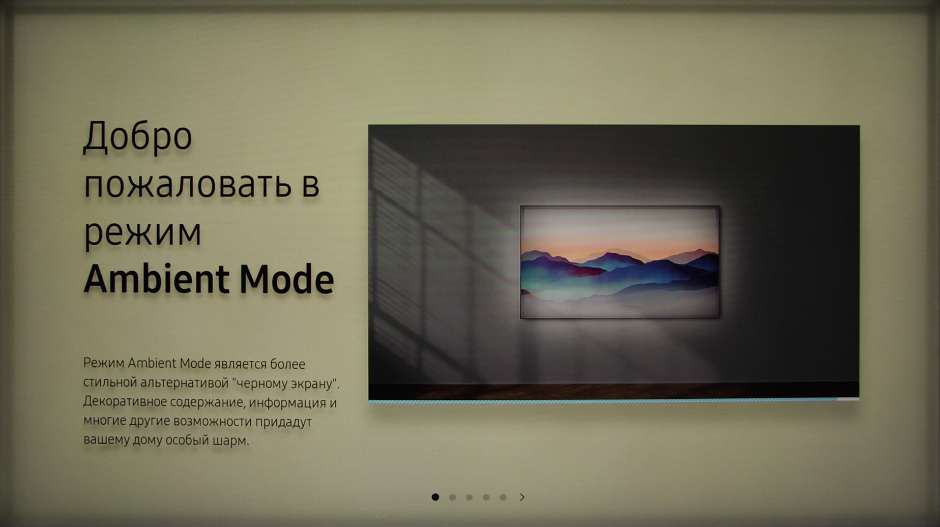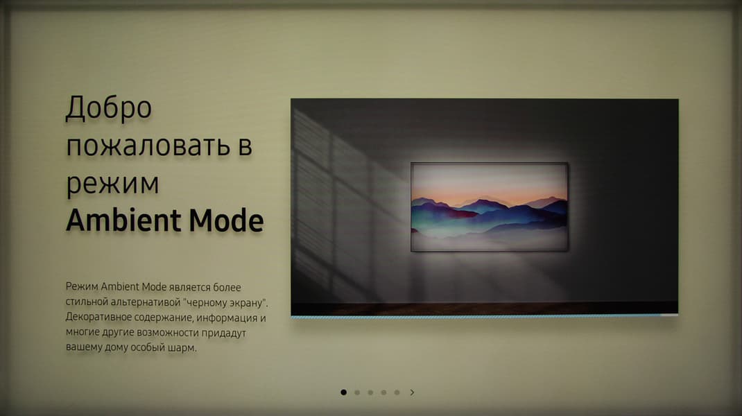 Специальный режим Ambient предназначен для демонстрации заставки на условно выключенном телевизоре. В этот режим работающий телевизор переключается при коротком нажатии на специальную кнопку на пульте, или из главного меню, или из приложения SmartThings, или голосовой командой.