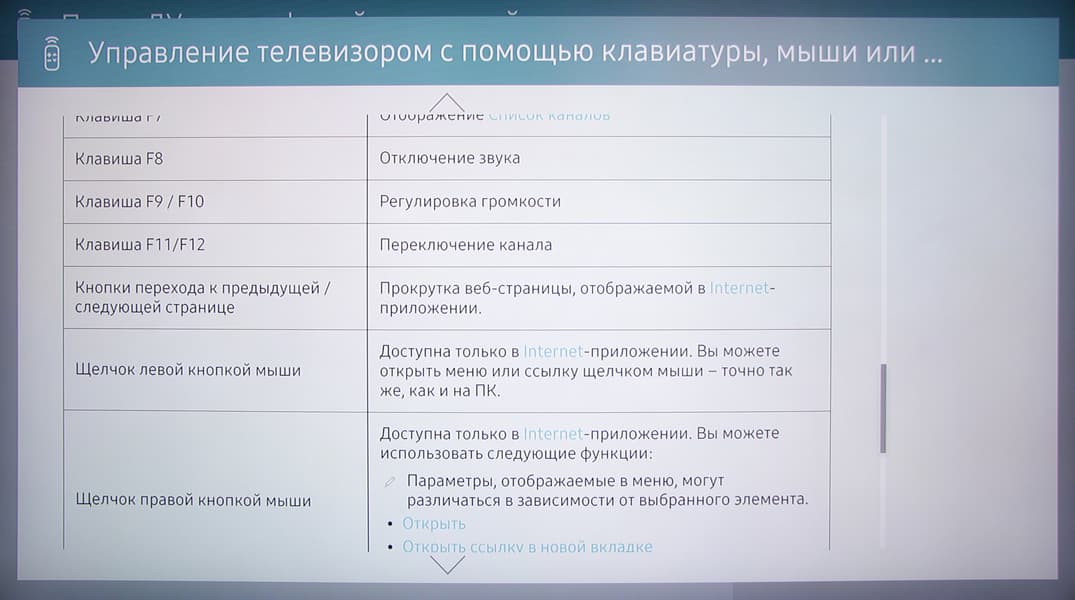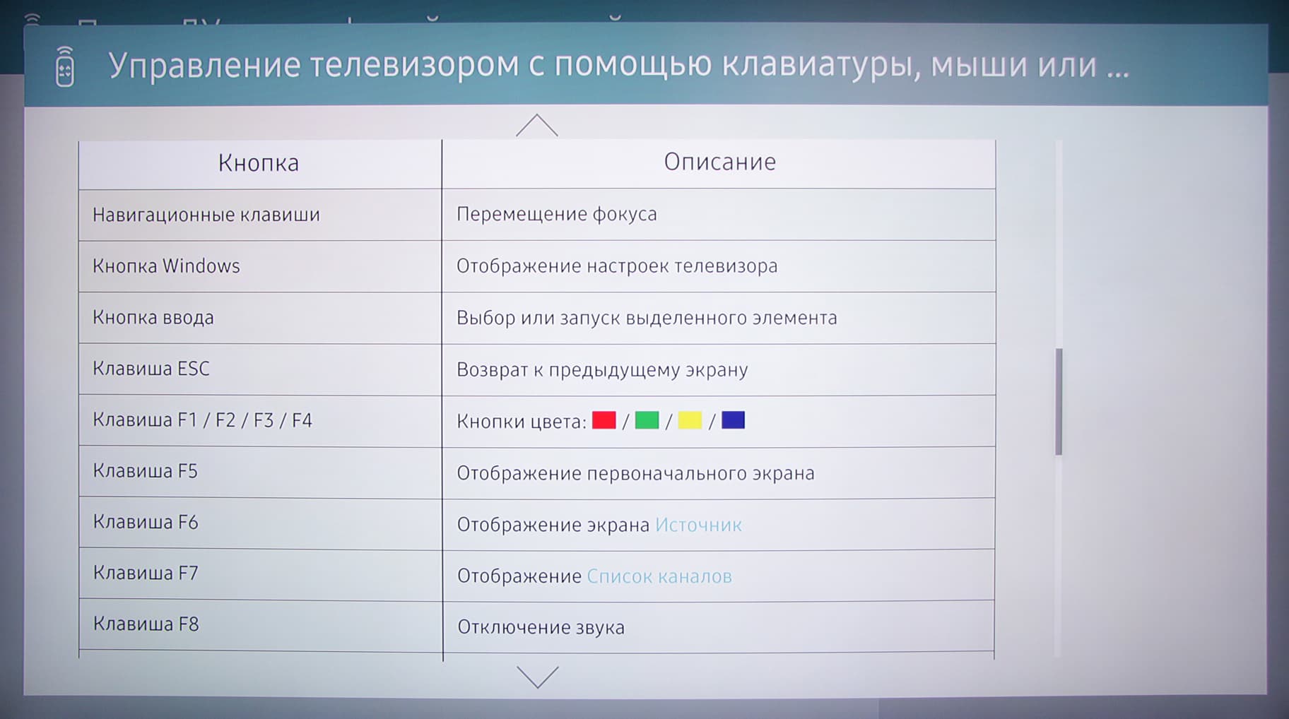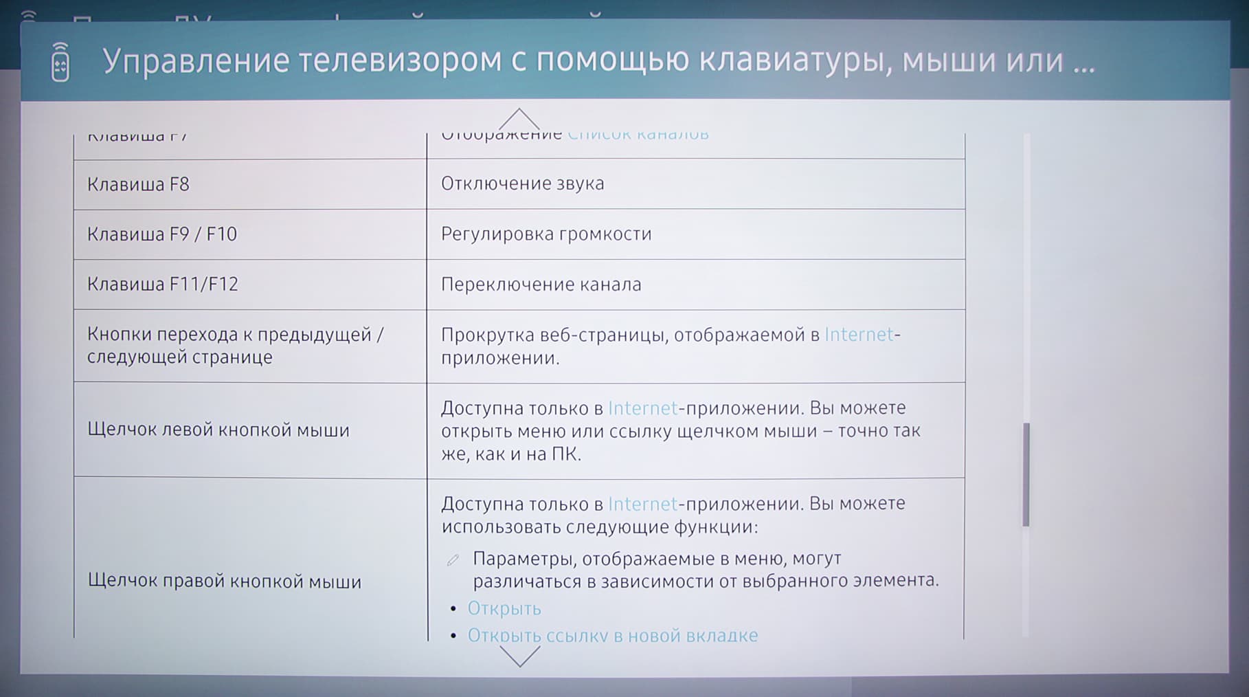 К телевизору можно подключить клавиатуру и мышь по USB и/или по Bluetooth (а также джойстики и другие игровые контроллеры). Эти устройства ввода, как и любая опробованная нами USB-периферия работают через USB-разветвитель, освобождая дефицитные USB-порты под другие задачи. Правда, мышь в интерфейсе самого ТВ не работает, курсор появляется в браузере Internet. С проводными и беспроводными клавиатурами и мышами от разных производителей не возникло никаких проблем. Поддерживается прокрутка колесиком, а задержка перемещения курсора мыши относительно движения самой мышью минимальная. Для подключенной клавиатуры можно выбрать альтернативную раскладку, в том числе и кириллическую самого распространенного варианта, при этом поддерживается смена раскладки клавиатуры (клавишей Alt) на основную (английскую) и обратно на выбранную. Некоторые клавиши клавиатуры напрямую вызывают ряд функций телевизора, подробности приведены во встроенной справке.
