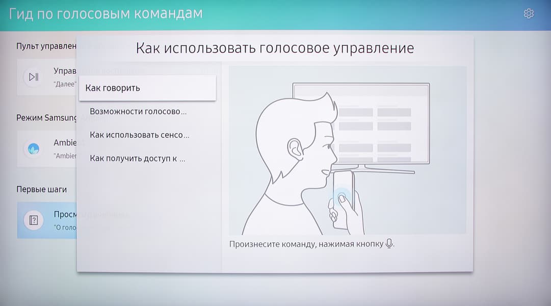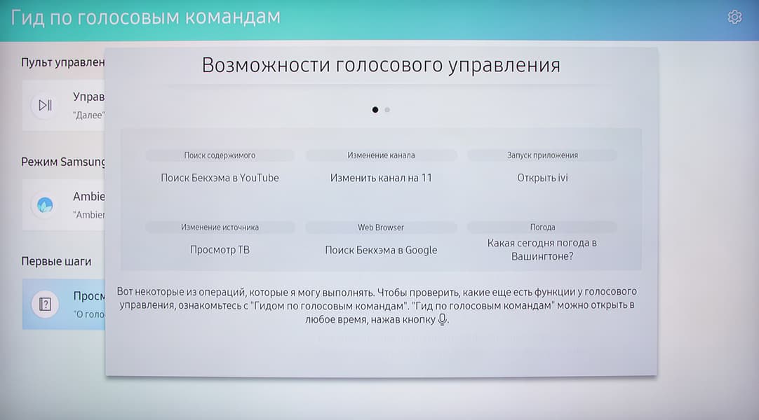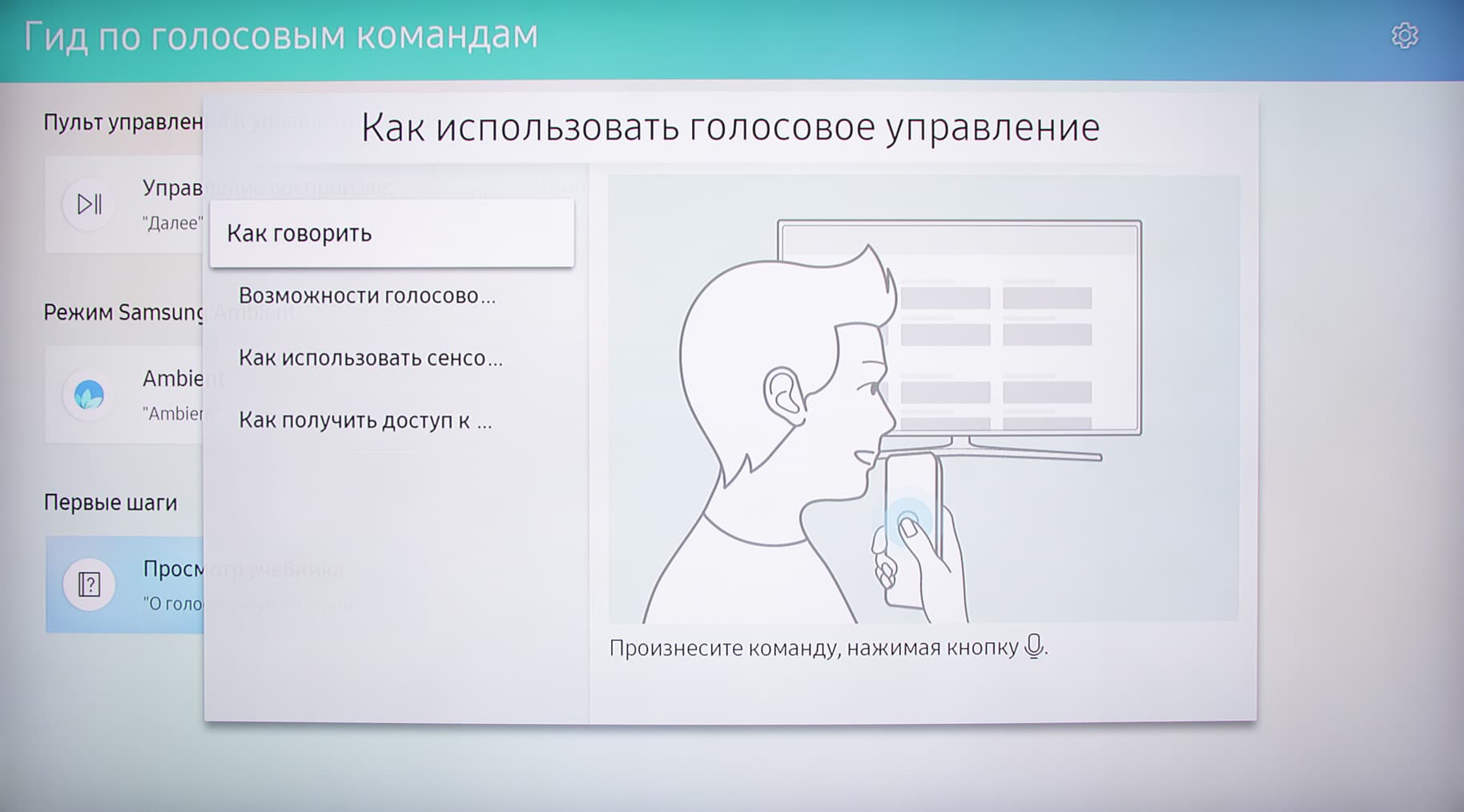 Для работы голосового управления требуется подключение к Интернету и согласие пользователя на работу соответствующей службы. В целом голосовое управление работает хорошо, но есть и особенности. Например, голосом не получается установить яркость подсветки на минимум (не воспринимаются значения «ноль» и «минимум»), но можно сначала сказать «Подсветка 1», а затем «Темнее». Синонимы слов почти никогда не распознаются как команды, поэтому лучше подсмотреть и запомнить точные названия пунктов меню и экранных виртуальных кнопок, чтобы при голосовом управлении использовать именно их. Все, нераспознанное как команды, телевизор предлагает поискать, и в результатах поиска будут видеоролики с YouTube. Есть возможность выполнить поиск с помощью определенной программы, узнать погоду и т. д.