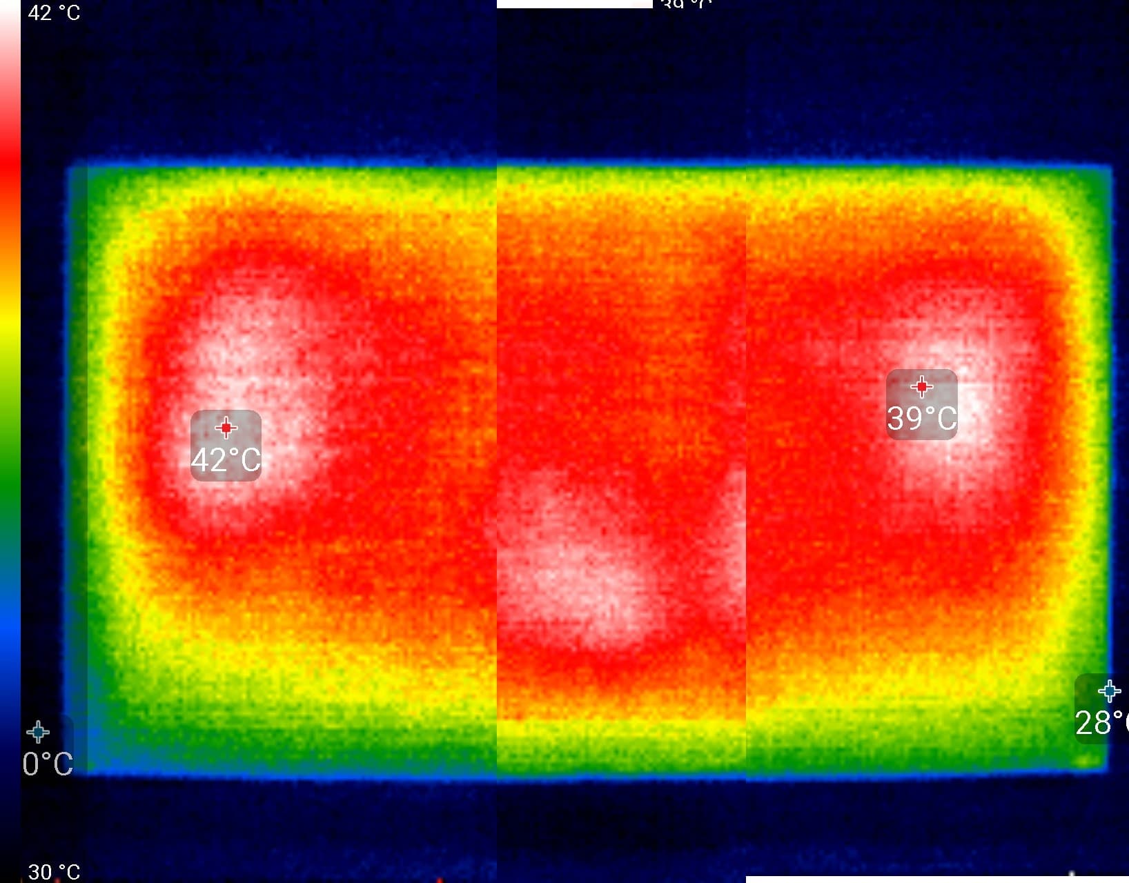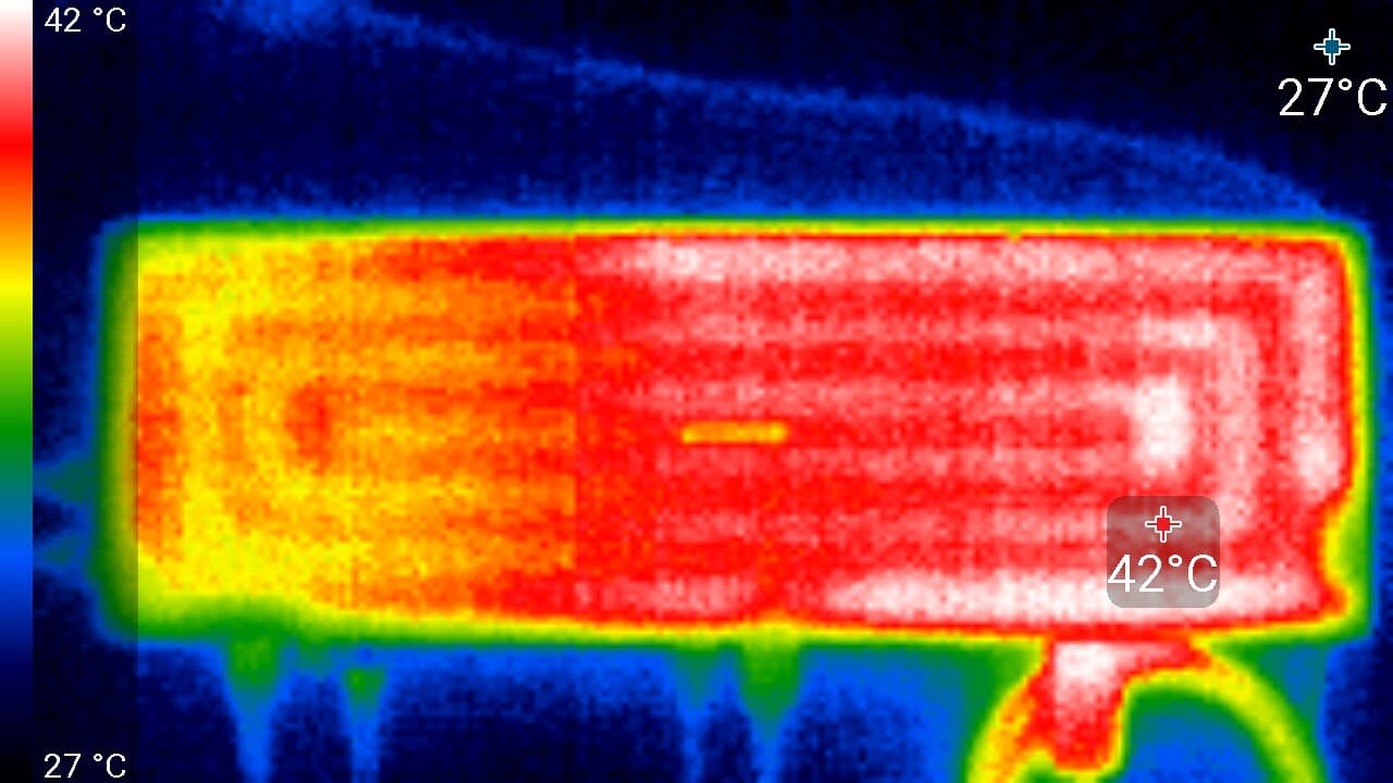 Максимальный нагрев локальных участков спереди составил 42 °C. Поверхность корпуса модуля One Connect при этом нагревается максимум до той же температуры: