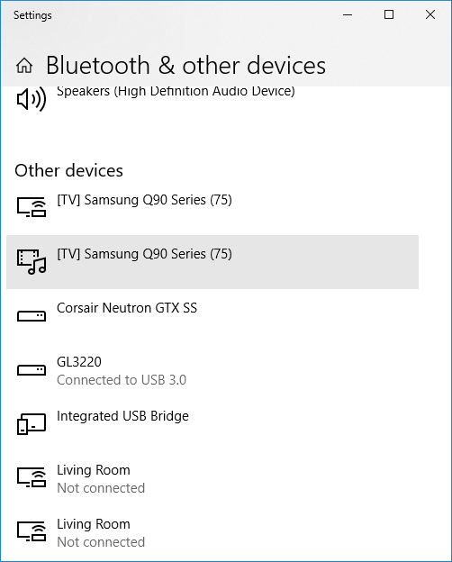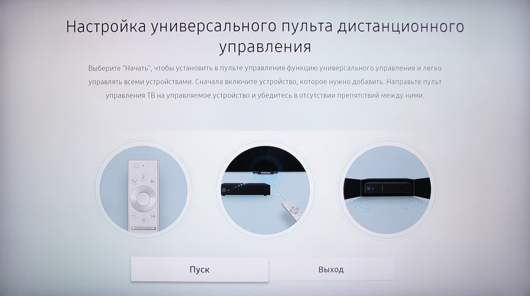 Работает пульт в основном по Bluetooth, по ИК дублируется только команда включения/выключения. Побочным следствие этого является необходимость выполнять сопряжение пульта и телевизора. При первом включении сопряжение должно выполняться автоматически, если этого не произошло, то необходимо направить пульт на ИК-приемник на телевизоре, затем нажать и удерживать две кнопки на ДУ, как это описано в руководстве. К несомненным плюсам относится возможность настроить этот пульт на управление другой аудио- и видеотехникой. Делается это при подключении новой для телевизора техники в полуавтоматическом режиме или согласно выводимым на экран подсказкам. Для управления сторонней техникой используются ИК-излучатели или пульта, или размещенные внутри модуля One Connect, в зависимости от того, на какой источник реагирует подключенное устройство.