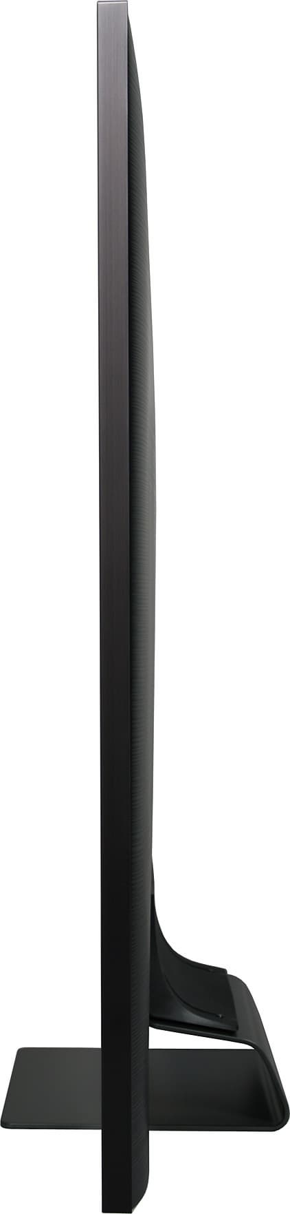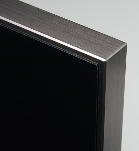 Дизайн строгий, декоративные элементы отсутствуют, в основном используется черный и серый цвета. Телевизор выглядит аккуратно как спереди, так и сзади. Экран не имеет рамок, в том смысле, что на его монолитной поверхности нет накладных выступающих вперед за плоскость элементов, есть только узкое обрамление из алюминиевого профиля. Этот профиль анодирован и окрашен в серый цвет.