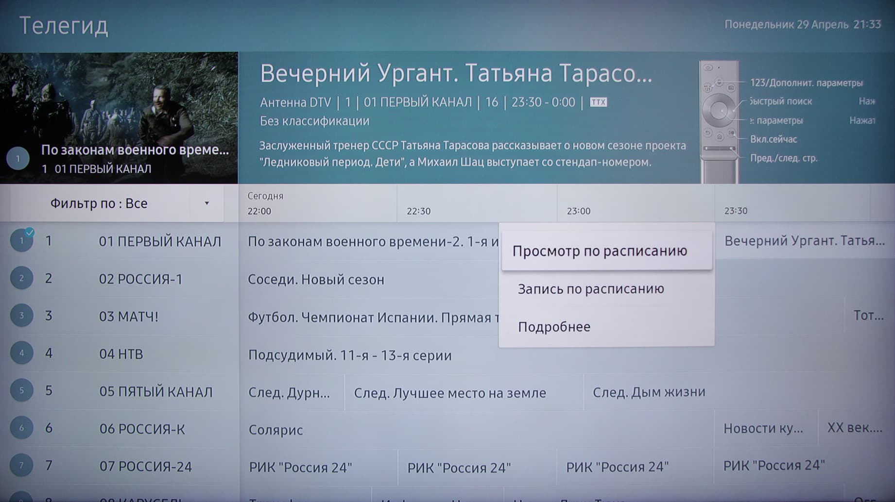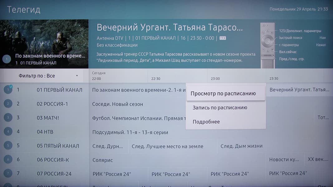 Есть хорошая поддержка электронной программы передач (если она передается) — можно посмотреть, что именно идет на текущем и других каналах, запрограммировать просмотр или запись программы или сериала и т. д.