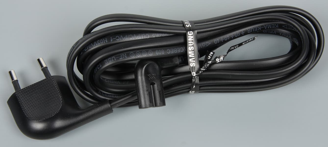 Комплектный сетевой кабель питания черного цвета и имеет длину 2,95 м. Оснащен он компактными Г-образными вилкой и разъемом.
