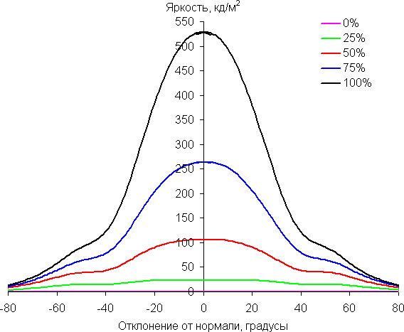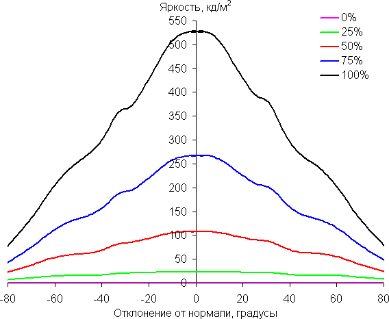 При отклонении от перпендикуляра к экрану в вертикальном направлении характер снижения яркости такой же, как и у типичной матрицы типа VA, используемой в телевизорах. Однако в при отклонении в горизонтальном направлении яркость снижается уже не так быстро и по критерию снижения яркости на 50% углы обзора примерно в 1,5 раза шире. Так проявляется работа дополнительного рассеивающего слоя, выявленного с помощью микрофотографий (см. раздел Микрофотографии матрицы). Некоторое улучшение углов обзора есть и при отклонении в диагональном направлении.