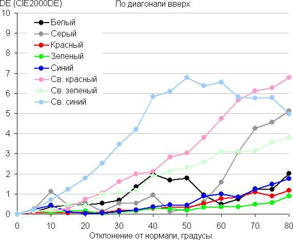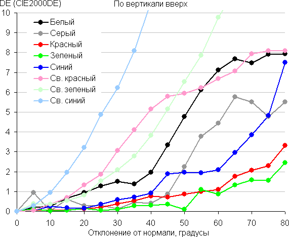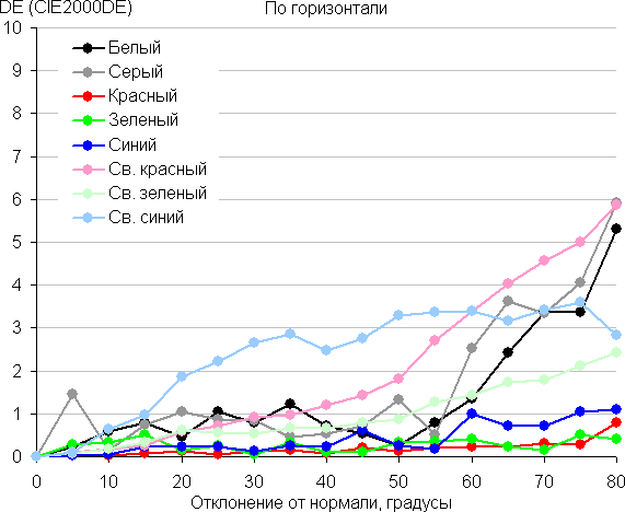 Для количественной характеристики изменения цветопередачи мы провели колориметрические измерения для белого, серого (127, 127, 127), красного, зеленого и синего, а также светло-красного, светло-зеленого и светло-синего полей во весь экран с использованием установки, подобной той, что применялась в предыдущем тесте. Измерения проводились в диапазоне углов от 0° (датчик направлен перпендикулярно к экрану) до 80° с шагом в 5°. Полученные значения интенсивностей были пересчитаны в отклонение ΔE относительно замера каждого поля при перпендикулярном положении датчика относительно экрана. Результаты представлены ниже: