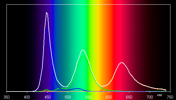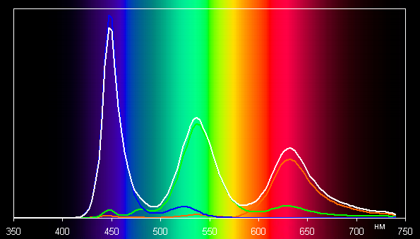 Ниже приведен спектр для белого поля (белая линия), наложенный на спектры красного, зеленого и синего полей (линии соответствующих цветов) для профиля Исходный: