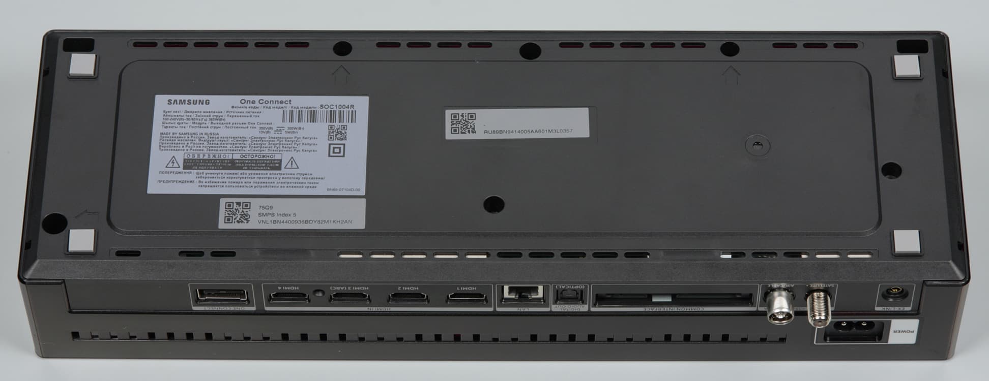 Напомним, что в нише на задней панели телевизора всего один разъем — для кабеля One Invisible Connection от модуля One Connect. От этого модуля на телевизор передаются как данные, так и питание, и все это по одному тонкому (диаметром 3,4 мм) и длинному (5 м) малозаметному кабелю с прозрачной оболочкой.