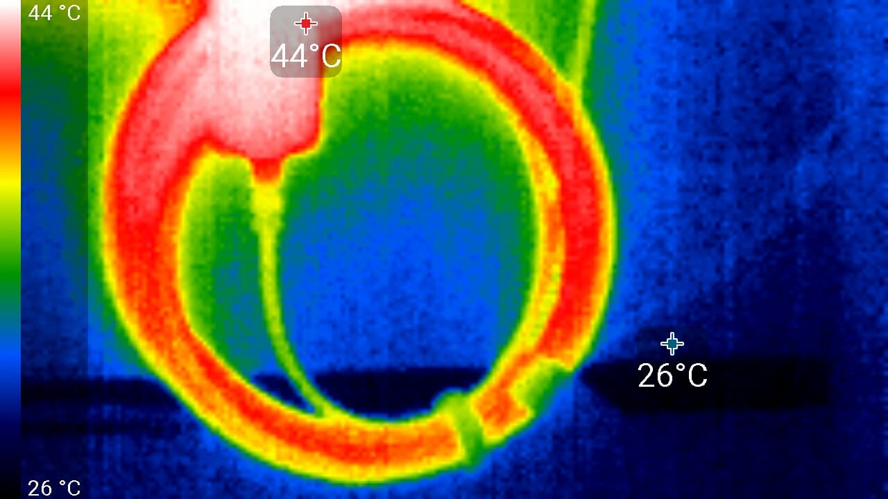 Кабель к телевизору от модуля One Connect, смотанный в бухту, также немного нагрелся, но нагрев разъема существенно выше:
