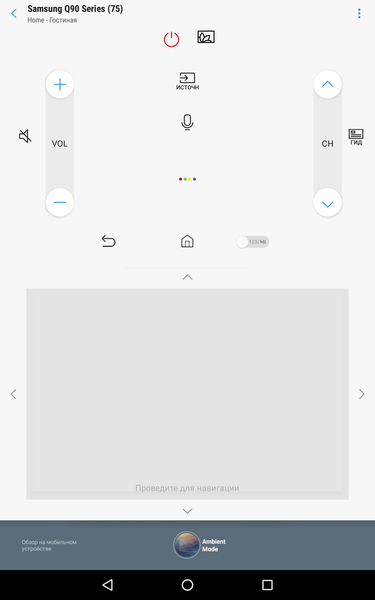 Кроме того, телевизором можно управлять посредством мобильного устройства с помощью фирменного приложения SmartThings для Android и iOS. В данном ПО телевизор представляется как одним из устройств «умного дома», входящих в экосистему SmartThings. Для доступа к устройствам SmartThings используется облачный сервис, поэтому телевизором можно управлять из любого места, где есть доступ к Сети, хотя в данном случае это не дает особых преимуществ. В ПО SmartThings в главном окне модуля работы с телевизором есть виртуальный пульт ДУ с кнопками и панелью координатного ввода. Дополнительно можно настраивать работу режима Ambient.