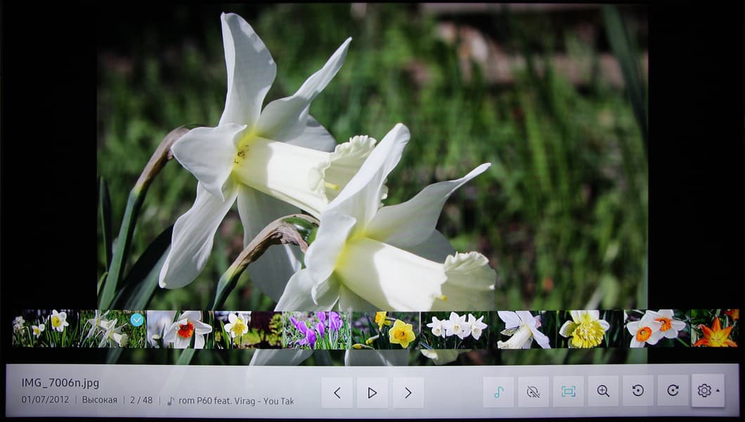 Нами подтверждена способность телевизора показывать растровые графические файлы в форматах JPEG, MPO (один ракурс), PNG и BMP, в том числе в виде слайд-шоу с эффектами перехода и под выбранную фоновую музыку.