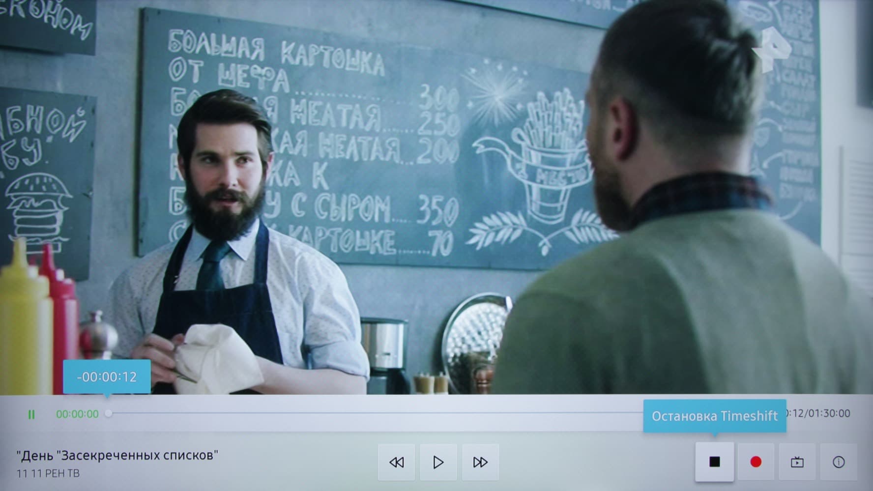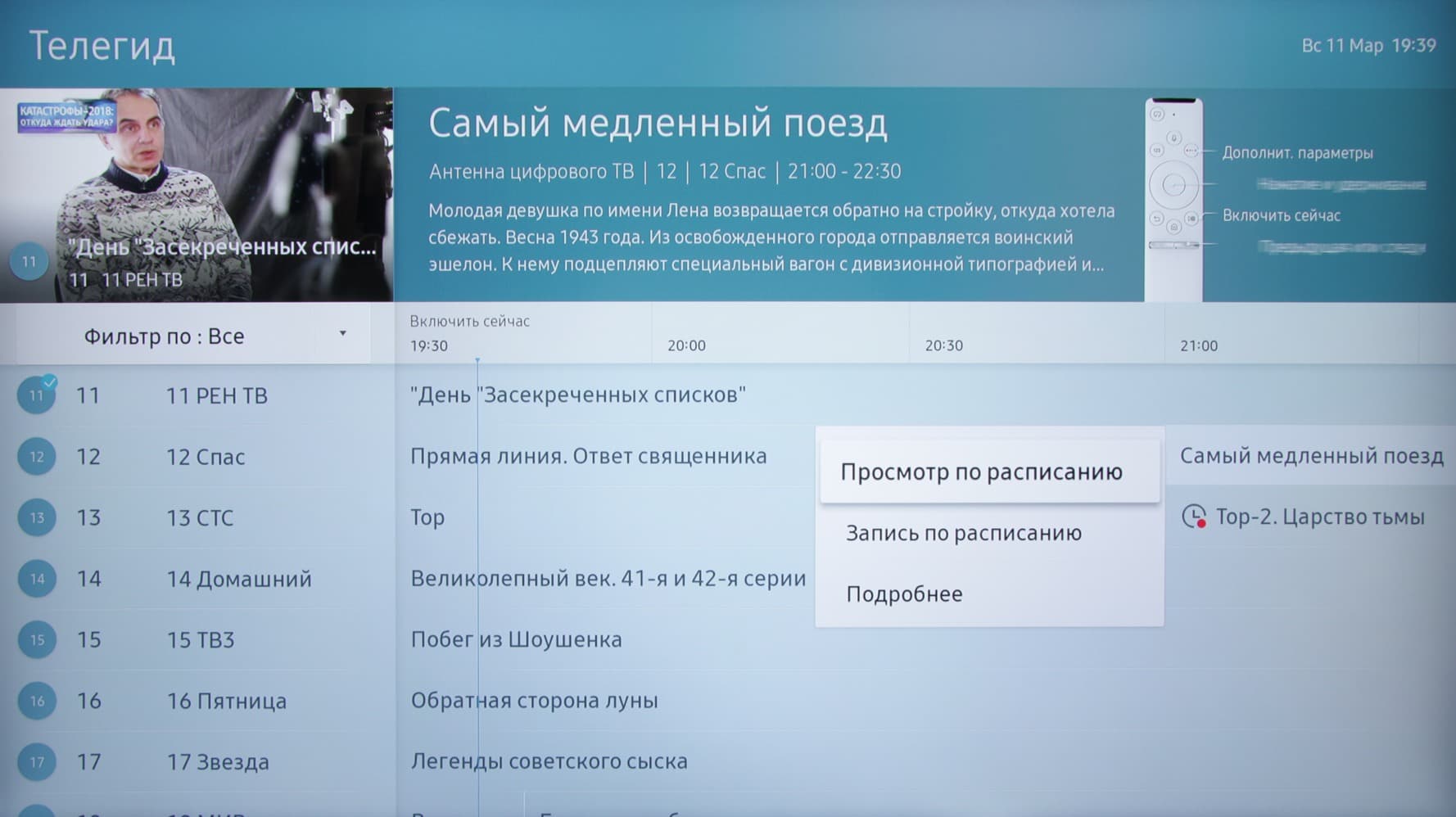 Качество изображения нескольких найденных аналоговых каналов было ужасным, но виноваты тут скорее расположение и тип антенны. Есть хорошая поддержка электронной программы передач — можно посмотреть, что именно идет на текущем и других каналах, запрограммировать просмотр или запись программы или сериала и т. д (значок часов с красной точкой — запись, а с зеленым треугольником — просмотр).
