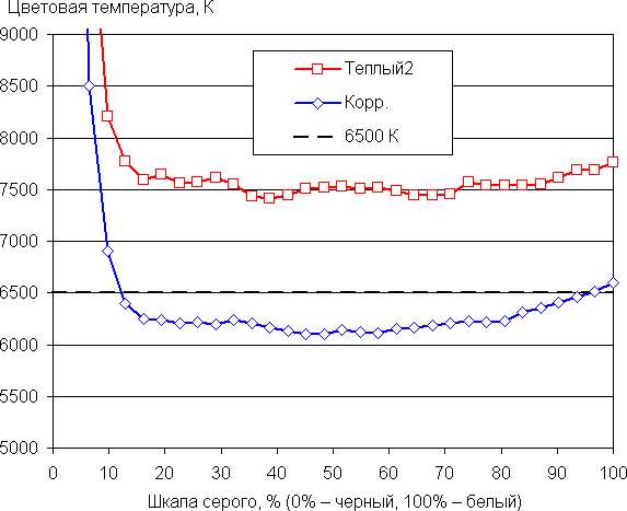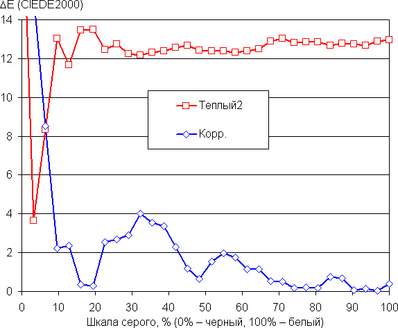 Графики ниже показывают цветовую температуру на различных участках шкалы серого и отклонение от спектра абсолютно черного тела (параметр ΔE) для профиля Стандартный при выборе варианта Теплый2 для настройки Оттенок — при таком сочетании с нашей точки зрения цветопередача максимально близка к стандартной, — и после коррекции цветового баланса регулировками усиления трех основных цветов: