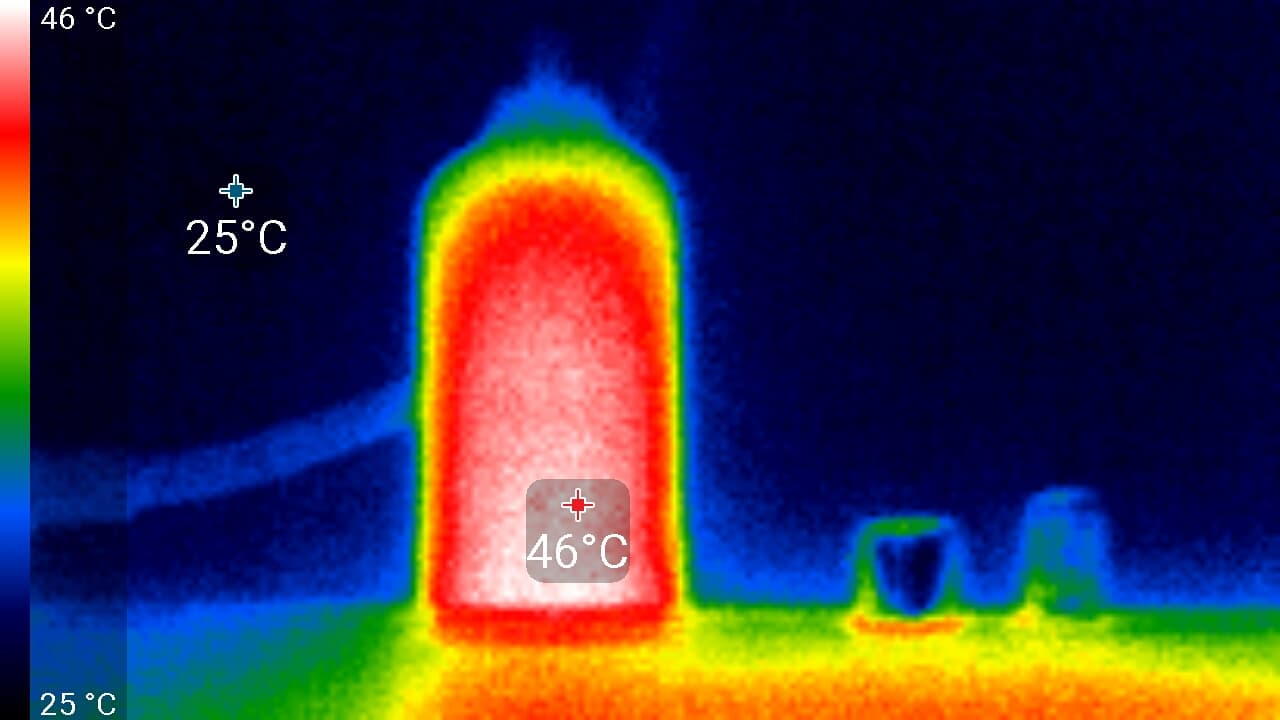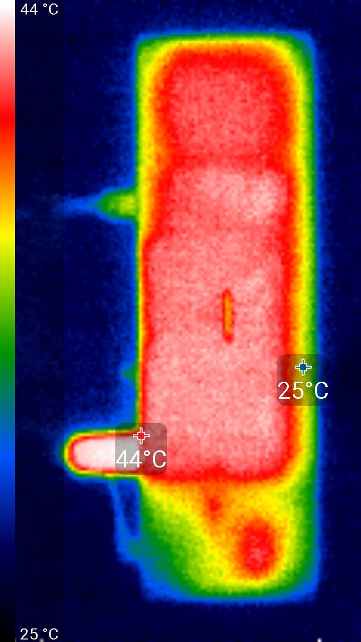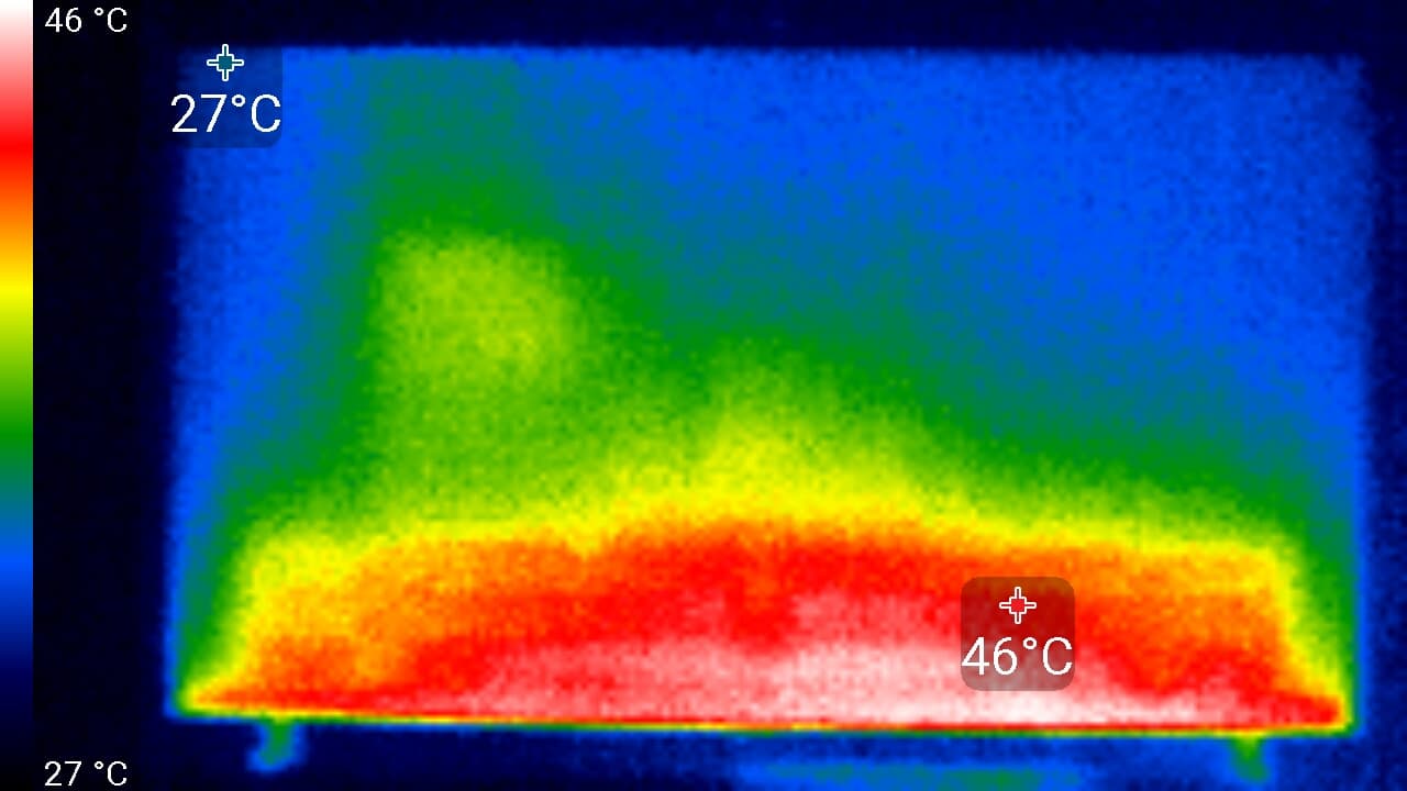 Видно, что основным источником тепла является светодиодная линейка по нижнему краю экрана. Максимальный нагрев локальных участков спереди составил 48 °C. Поверхность корпуса модуля One Connect при этом нагревается не очень сильно (до 41 °C), но корпус разъема One Connect греется уже до 46 °C.