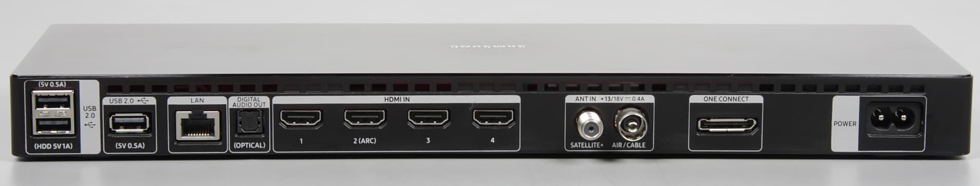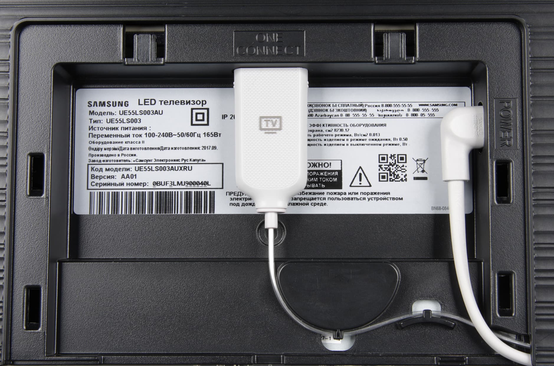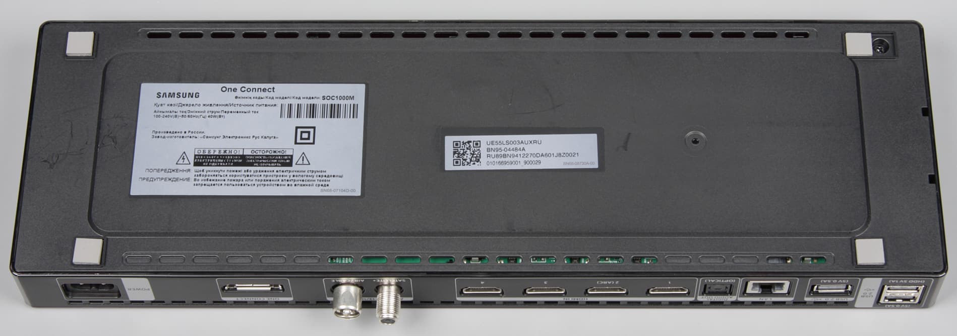 Напомним, что в нише на задней панели телевизора всего два разъема — питания и от модуля One Connect, представляющего собой небольшую (362×115×32 мм) прямоугольную коробку.