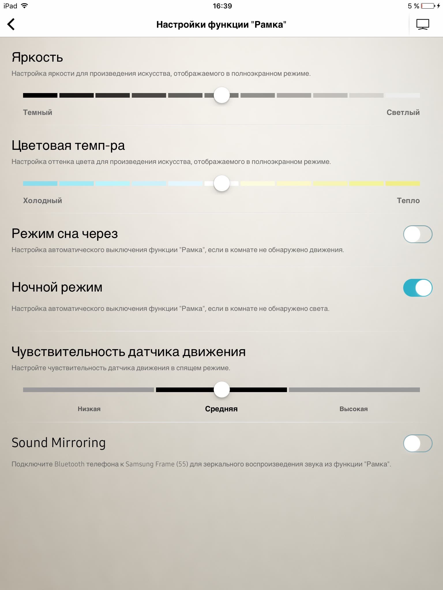 Расширенные настройки режима «Картина» доступны только из приложения Smart View. Там пользователь может отрегулировать яркость, цветовой тон, включить режимы автоматического перехода в спящий режим, если в помещении выбранный период времени отсутствует движение, или если выключен свет, настроить чувствительность датчика движения и включить режим передачи звука с мобильного устройства по Bluetooth на телевизор. В последнем случае показ картины может иметь звуковое сопровождение.
