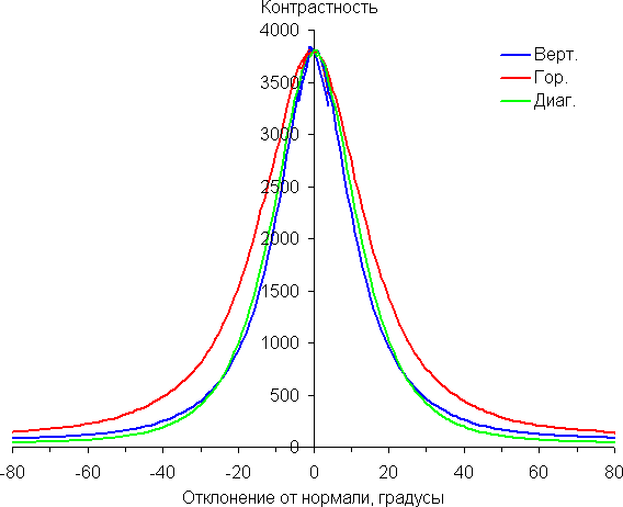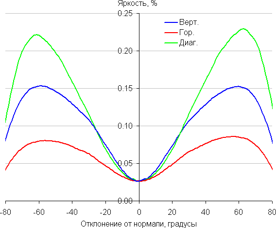 Отметим относительно плавное уменьшение яркости при отклонении от перпендикуляра к экрану во всех трех направлениях, при этом графики яркости полутонов не пересекаются во всем диапазоне измеряемых углов. Яркость черного поля при отклонении от перпендикуляра к экрану возрастает, и при диагональном и вертикальном отклонении возрастает существенно, но всего до примерно 0,23% от максимальной яркости белого поля и только при очень большом отклонении (примерно при 63°). Это очень хороший результат. Контрастность в диапазоне углов ±82° для всех направлений значительно превышает 10:1.