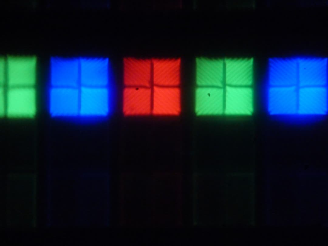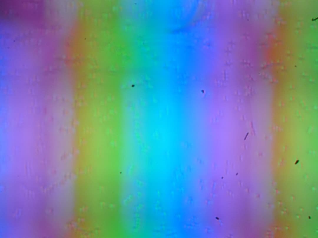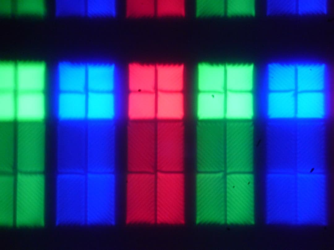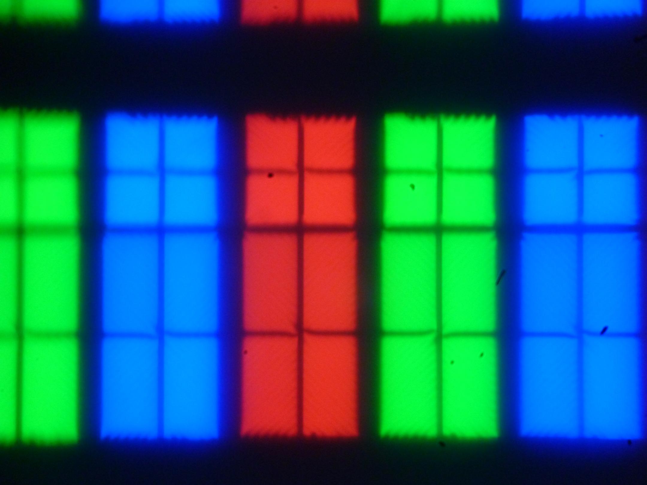Видно, что субпиксели трех цветов (красного, зеленого и синего) поделены на две различающиеся по площади и независимо управляемые области, каждая из которых разделена на четыре участка с доменами в различающейся ориентации. Такое сложное устройство в принципе способно обеспечить широкий динамический диапазон по количеству оттенков, так как с ростом яркости области включаются последовательно, и хорошие углы обзора, чему способствует вариация ориентации ЖК в доменах. Отметим, что никакого видимого «кристаллического» эффекта (микроскопической вариации яркости и оттенка) в данном случае нет. Фокусировка на поверхности экрана выявила хаотично расположенные микродефекты поверхности, отвечающие собственно за матовые свойства: