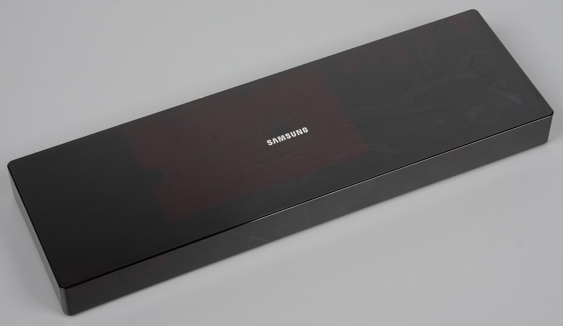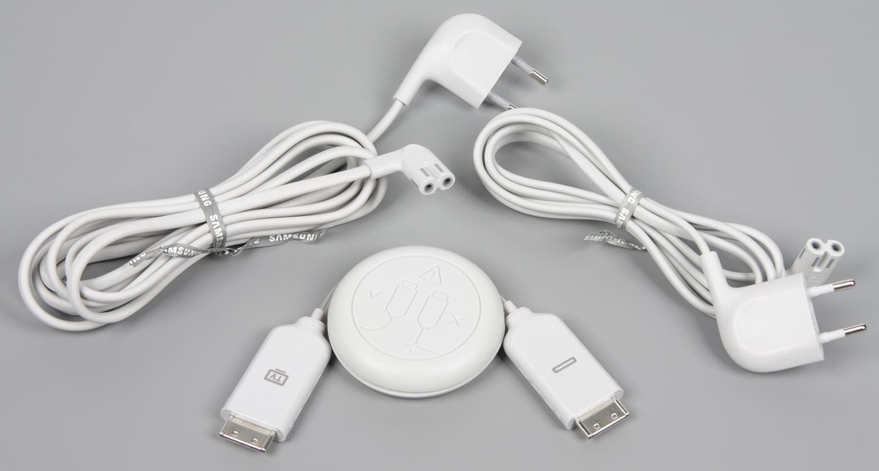 Вынос всех разъемов для подключения внешних устройств — это удобно, так как телевизор можно поставить в нишу или повесить на стену, где доступ к разъемам на задней панели будет затруднен, а модуль One Connect поместить в удобном для подключения периферии месте. Комплектные кабели питания белого цвета и имеют длину порядка 3 м (к телевизору ) и 1,5 м (к модулю One Connect). Они оснащены компактными Г-образными вилками и разъемами. Корпус модуля One Connect изготовлен из пластика с матовой поверхностью. Сверху пластик прозрачный, но настолько плотно тонированный красным, что при обычном освещении выглядит черным, а днище модуля — из черного пластика. На днище есть вентиляционные отверстия, а по углам приклеены невысокие резиновые ножки, которые из-за выпуклости в центре едва достают до поверхности, на которой лежит модуль.