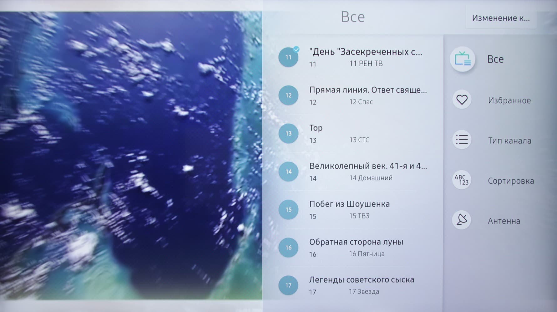 Отметим, что в целом ни к стабильности работы, ни к отзывчивости оболочки у нас никаких претензий не возникло. На команды с пульта ТВ реагирует почти моментально. Несмотря на разнообразную анимацию и звуковые эффекты, навигация по меню быстрая. Вот только возврат из меню с настройками к текущему просмотру выполняется в несколько шагов и через главный экран, ну или мы не разобрались, как это сделать быстро. Меню с настройками ТВ занимает большую часть экрана, надписи в нем читаемые. Отметим, что фон меню специально сделан слегка с градиентами цветового тона, видимо, для маскировки неравномерности белого поля, которой, кстати, по факту практически нет. Есть русифицированный вариант интерфейса. Качество перевода хорошее, и самое главное, что настройки в большинстве случаев меняют именно то, что ожидаешь, исходя из их наименования.