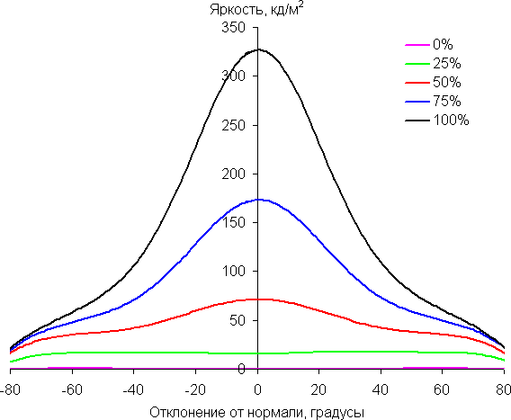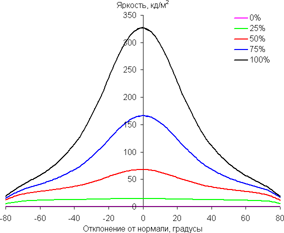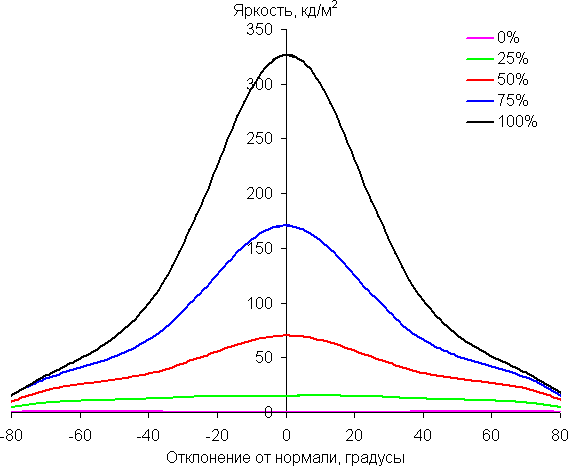 Чтобы выяснить, как меняется яркость экрана при отклонении от перпендикуляра к экрану, мы провели серию измерений яркости белого в центре экрана в широком диапазоне углов, отклоняя ось датчика в вертикальном, горизонтальном и диагональном (из угла в угол) направлениях.