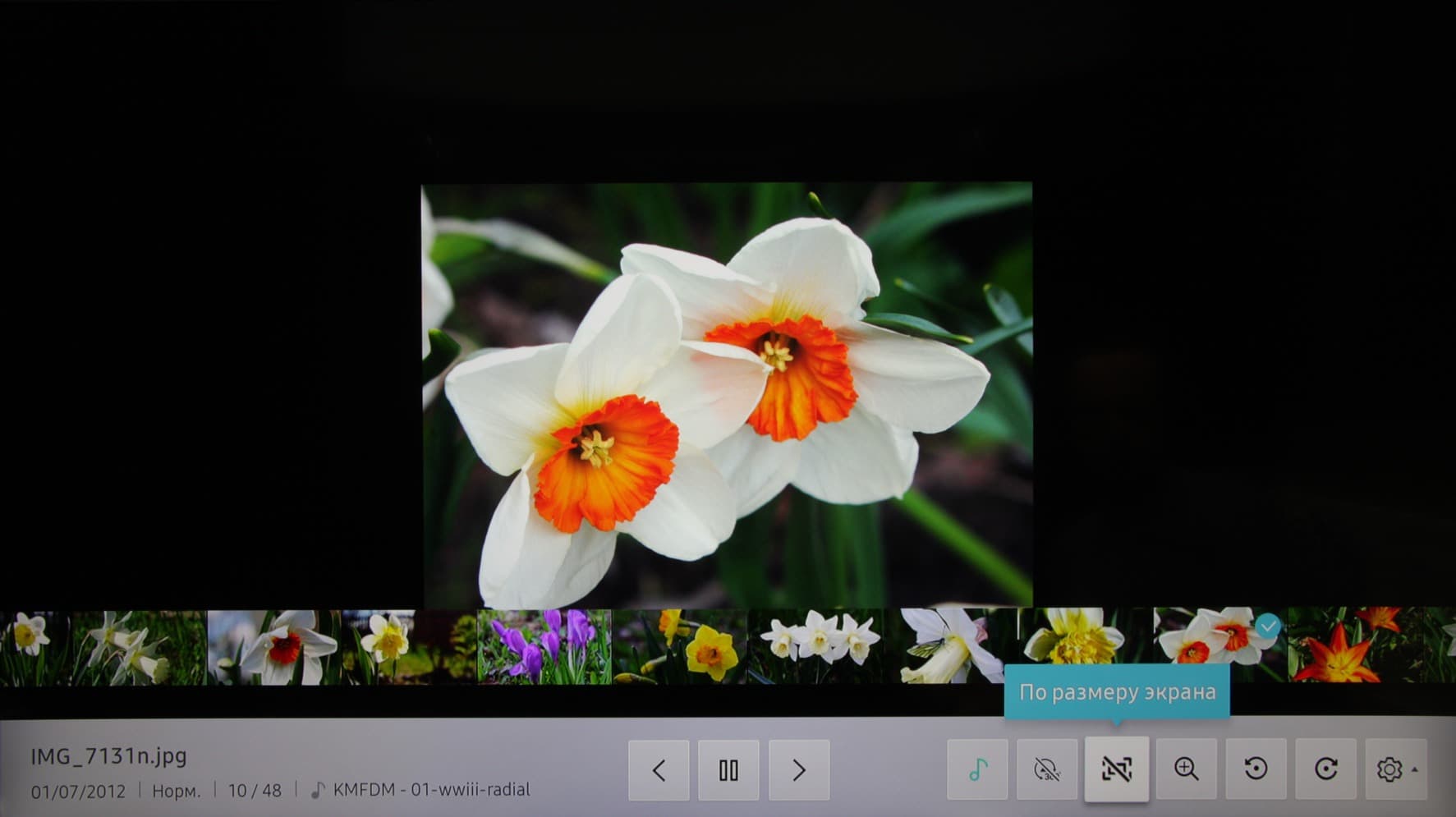 При поверхностном тестировании воспроизведения мультимедийного контента мы ограничились рядом файлов, запускаемых в основном с внешних USB-носителей. Источниками мультимедийного контента также могут быть серверы UPnP (DLNA) и мобильные устройства, на которых запущена программа Smart View, установившая связь с телевизором. Были опробованы жесткие диски, внешние SSD и обычные флешки. Два опробованных жестких диска работали от любого из трех USB-портов, а в режиме ожидания самого ТВ, жесткие диски отключались. Отметим, что телевизор поддерживает USB-накопители как минимум с файловыми системами FAT32, exFAT и NTFS, а с кириллическими названиями файлов и папок не было никаких проблем. Нами подтверждена способность телевизора показывать растровые графические файлы в форматах JPEG, MPO (один ракурс), PNG и BMP, в том числе в виде слайд-шоу с эффектами перехода и под выбранную фоновую музыку.