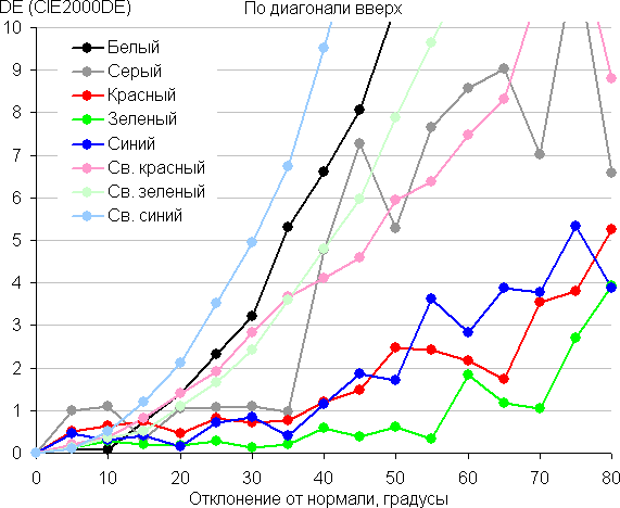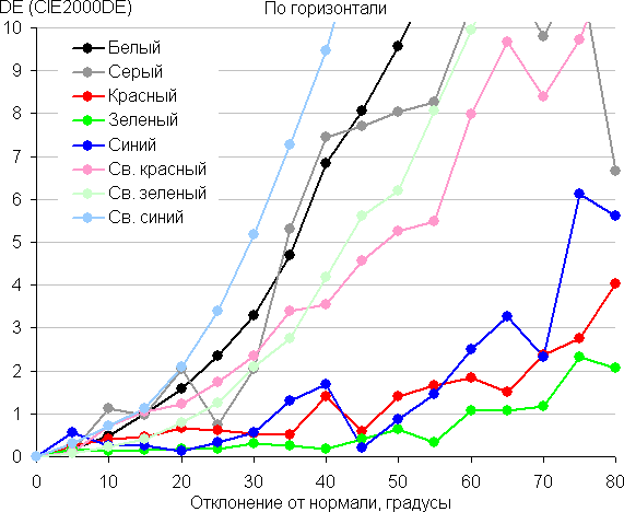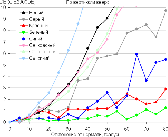 Для количественной характеристики изменения цветопередачи мы провели колориметрические измерения для белого, серого (127, 127, 127), красного, зеленого и синего, а также светло-красного, светло-зеленого и светло-синего полей во весь экран с использованием установки, подобной той, что применялась в предыдущем тесте. Измерения проводились в диапазоне углов от 0° (датчик направлен перпендикулярно к экрану) до 80° с шагом в 5°. Полученные значения интенсивностей были пересчитаны в отклонение ΔE относительно замера каждого поля при перпендикулярном положении датчика относительно экрана. Результаты представлены ниже: