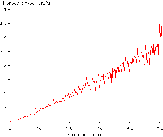 Для оценки характера роста яркости мы измерили яркость 256 оттенков серого (от 0, 0, 0 до 255, 255, 255) при подключении к ПК в режиме RGB при 3840×2160 и 60 Гц, параметр Гамма в настройках ТВ равен BT.1886 и другие значения недоступны. График ниже показывает прирост (не абсолютное значение!) яркости между соседними полутонами: