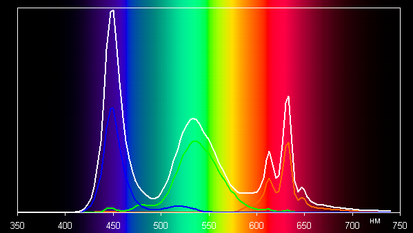 Видно, что спектры компонент относительно хорошо разделены, что и позволяет получить цветовой охват, которые немного шире sRGB.