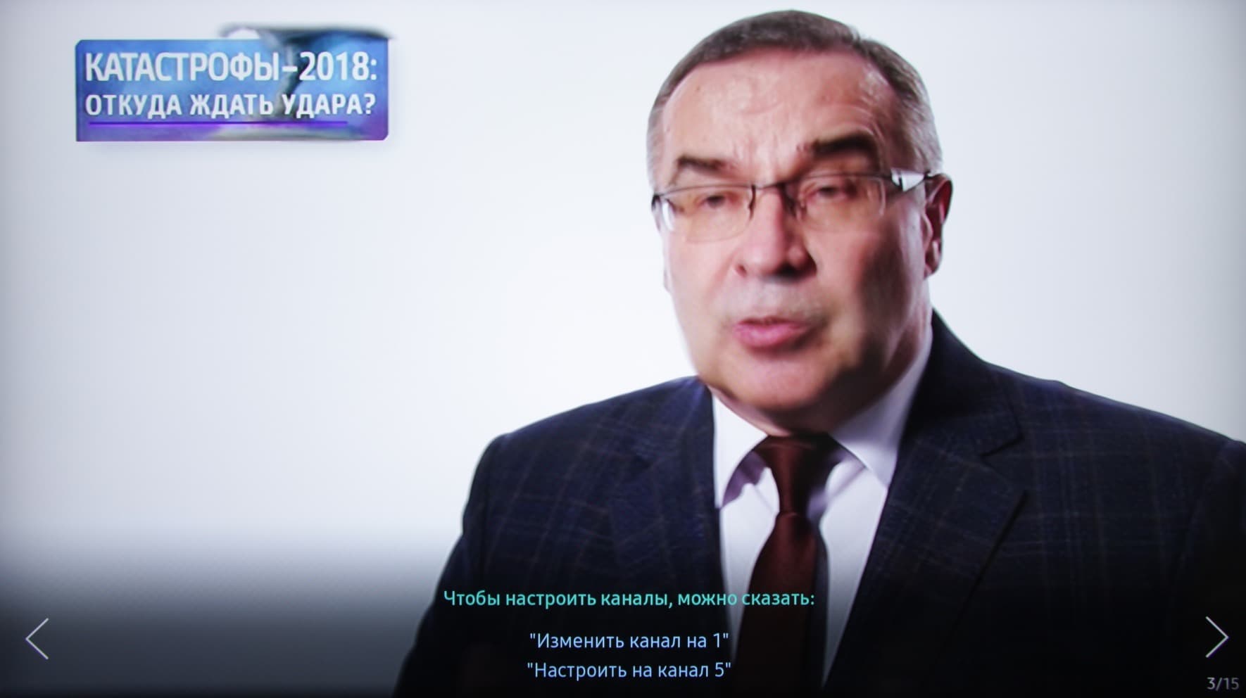 Корпус пульта изготовлен из белого пластика с матовой поверхностью. Пульт слегка изогнут под руку и удобно в ней лежит. Есть две кнопки-качельки изменения громкости и переключения ТВ-каналов. Нажатие на эти кнопки без отклонения выключает/включает звук и выводит ТВ-программу, соответственно. Подсветки нет. В передней части есть отверстие микрофона. Нажатие на кнопку с изображением микрофона приглушает звук телевизора и переводит его в состояние ожидания голосовой команды. О каких-то воспринимаемых телевизором командах можно догадаться интуитивно, дополнительная информация по голосовым командам приведена во встроенной справке (на 15 страницах).