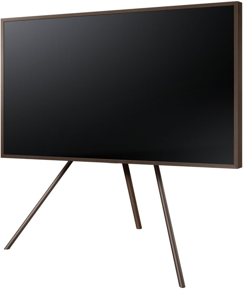 Альтернативный способ установки телевизора без использования штатных ножек — это вариант крепления телевизора на стену с помощью входящего в комплект поставки фирменного кронштейна, обеспечивающего установку телевизора впритык к стене практически без зазора. Если по какой-то причине фирменный кронштейн не подходит, то можно использовать стороннее крепление под монтажные отверстия VESA 400 на 400 мм. Варианты на этом не заканчиваются, еще есть фирменная напольная трехногая подставка, на которой телевизор будет напоминать установленную на мольберт картину (изображение с сайта Samsung):
