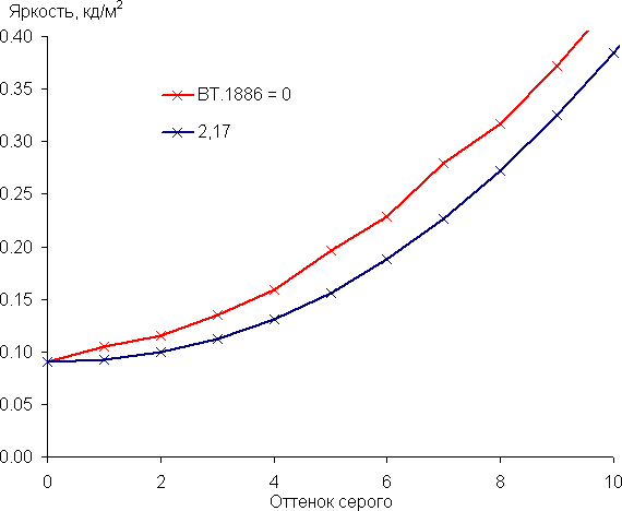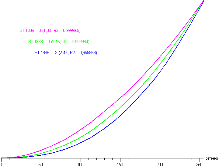 Настройкой с названием BT.1886 (от −3 до +3 единиц с шагом в единицу) можно чуть высветлить или затемнить изображение (значения показателей аппроксимирующей функции приведены в скобках в подписях):