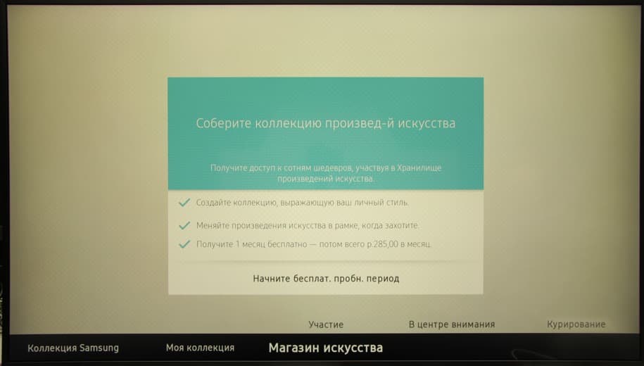 Пользователь может создать свой набор изображений, загрузив их или с USB-устройства, подключенного к телевизору, или с мобильного устройства с помощью приложения Smart View. Кроме того, за 285 рублей в месяц пользователь получает доступ к Магазину искусства с большим выбором художественных произведений.