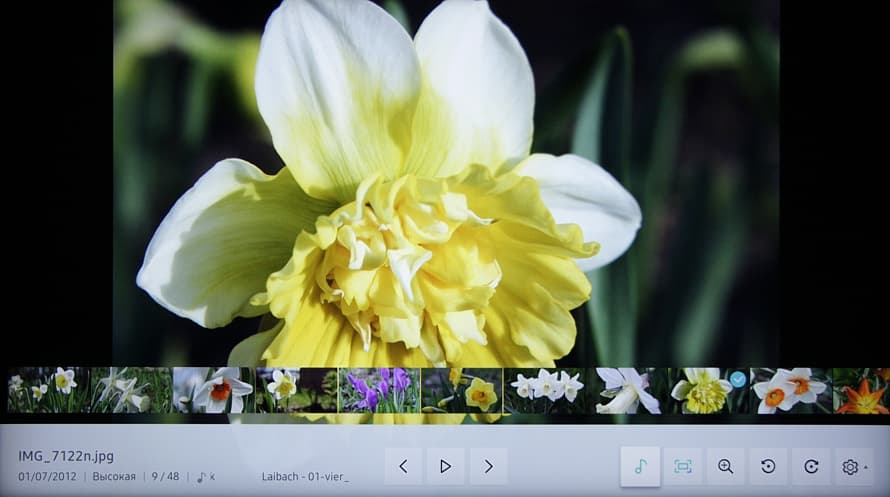 Нами подтверждена способность телевизора показывать растровые графические файлы в форматах JPEG, MPO (один ракурс), PNG и BMP, в том числе в виде слайд-шоу с эффектами перехода и под выбранную фоновую музыку. Изображения размером 3840×2160 пикселей выводятся один к одному по пикселям в истинном разрешении 4К и даже без снижения цветовой четкости.