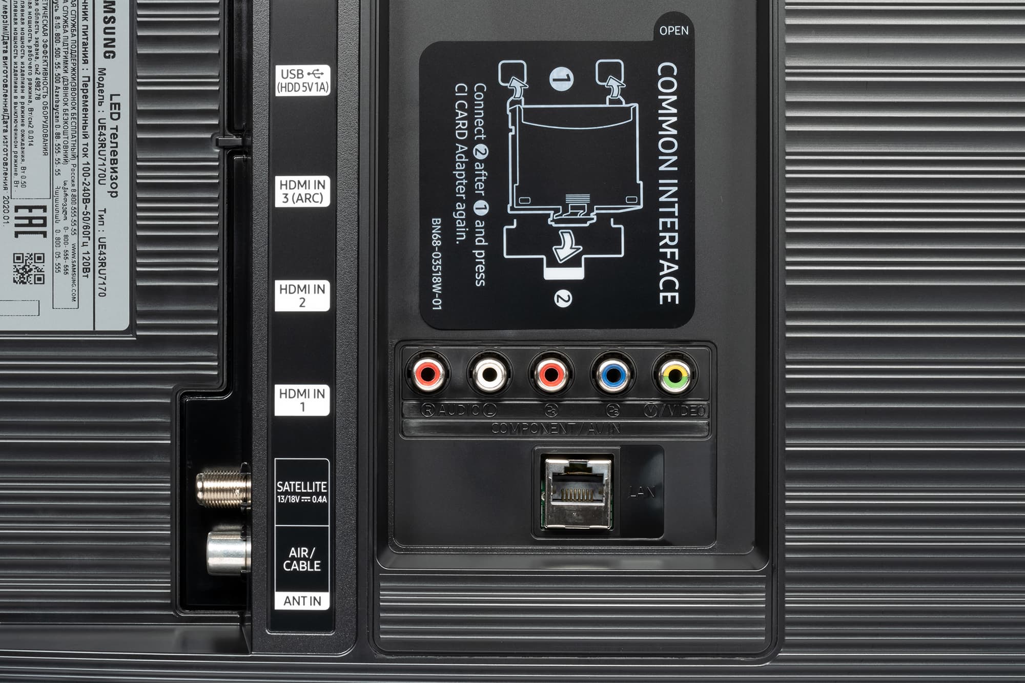 Основные интерфейсные разъемы размещены в двух нишах на задней панели и направлены вбок или назад. Подключать кабели к разъемам относительно удобно, затруднение может быть только с кабелем проводной сети, когда телевизор висит на стене (аналоговые интерфейсы в виду их низкой актуальности не учитываем). Над аналоговыми входами есть разъем для адаптера карты CI, закрытый наклейкой с инструкцией по установке этого адаптера.
