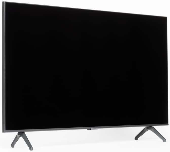 Подставка выполнена в виде двух Y-образных ножек, вставляющихся в гнезда на нижнем торце. Опираются ножки на резиновые накладки. Расстояние между ножками 79 см. Сзади на каждую из ножек можно нащелкнуть кабельный фиксатор, чтобы кабели спускались назад по ножкам и не ухудшали вид телевизора спереди и сзади. Стоит телевизор устойчиво, жесткость конструкции подставки достаточная. Телевизор, установленный на горизонтальную поверхность на штатную подставку, стоит вертикально без видимого наклона.