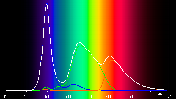 Ниже приведен спектр для белого поля (белая линия), наложенный на спектры красного, зеленого и синего полей (линии соответствующих цветов) для профиля Исходный: