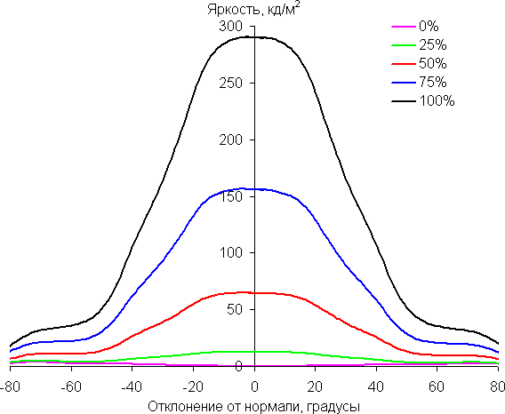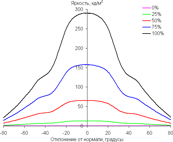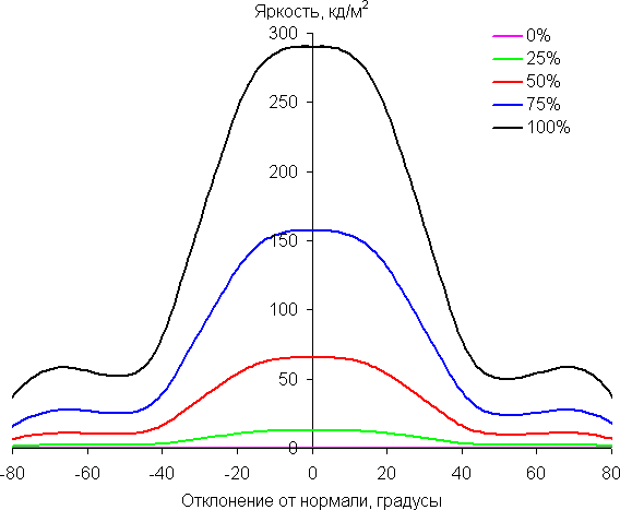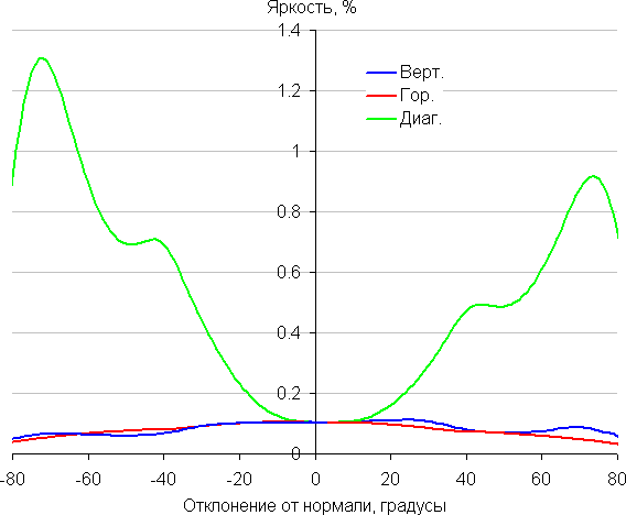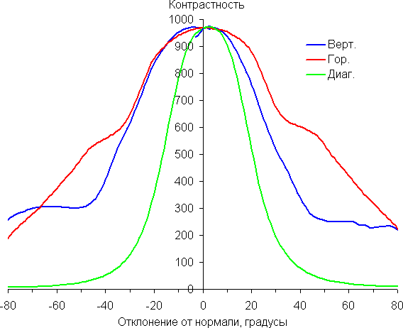 Отметим относительно плавное уменьшение яркости при отклонении от перпендикуляра к экрану во всех трех направлениях, при этом графики яркости полутонов не пересекаются во всем диапазоне измеряемых углов. В области малых отклонений яркость меняется очень мало, это повышает качество восприятия при правильном расположении зрителя относительно телевизора. Впрочем в целом по снижению яркости углы обзора не очень широкие. При отклонении в диагональном направлении яркость черного поля начинает резко возрастать уже при 20°-30° отклонения от перпендикуляра к экрану (но черное поле все равно остается условно нейтрально-серым). Если сидеть недалеко от экрана, то черное поле по углам будет заметно светлее, чем в центре. Контрастность в диапазоне углов ±82° в случае отклонения по диагонали приближается к отметке 10:1, и опускается ниже при отклонении более, чем на 67° в одном направлении и 78° в другом.