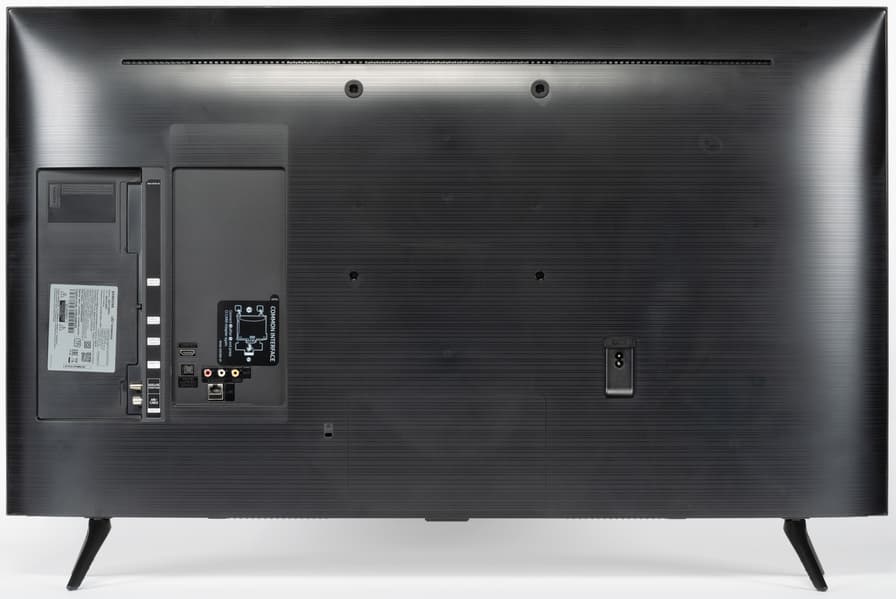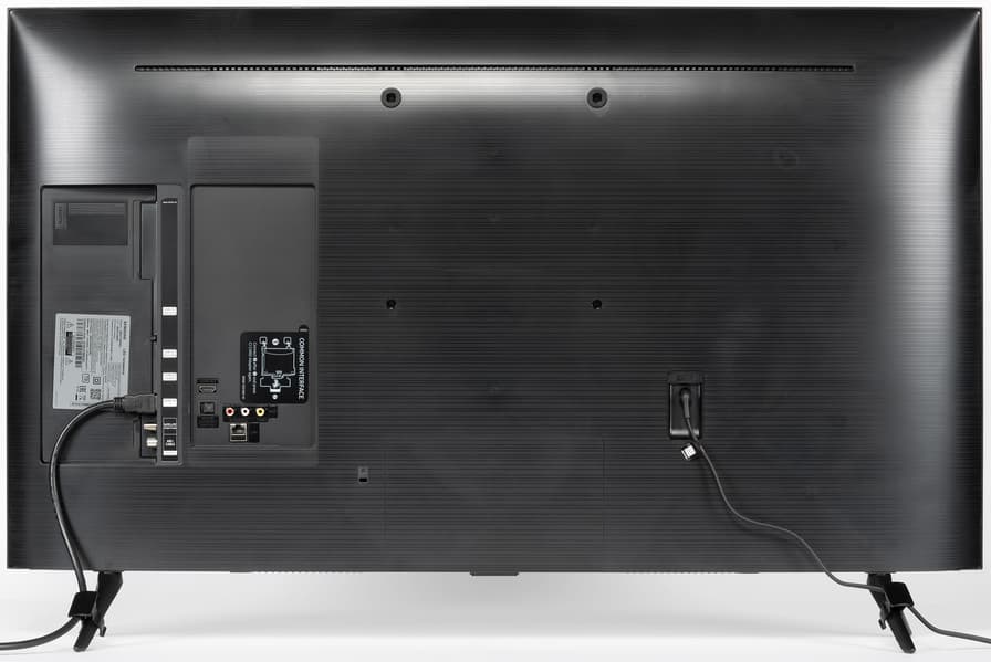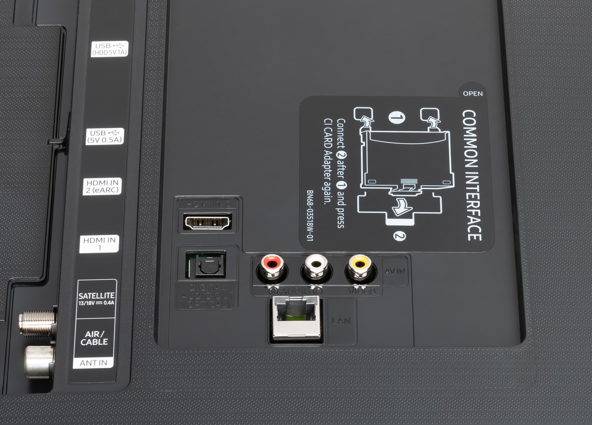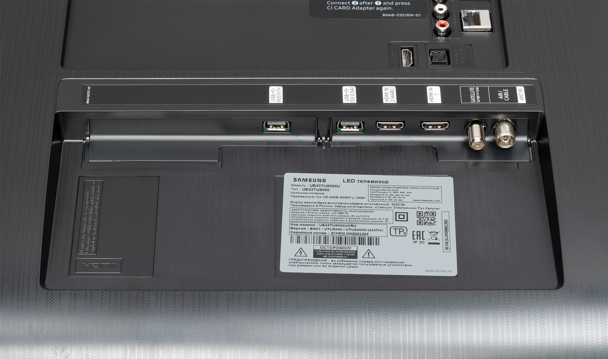 Часть интерфейсных разъемов размещены в нише сзади и направлены вбок. Подключать кабели к ним относительно удобно. Рядом с ними в неглубокой нише есть разъем для адаптера карты CI, закрытый наклейкой с инструкцией по установке этого адаптера, и еще несколько интерфейсных разъемов, направленных назад. К этим разъемом будет очень неудобно подключаться при настенной установке телевизора. Зачем так сделано — непонятно, ведь в первой нише еще много свободного места. В отдельной небольшой нише находится разъем питания.