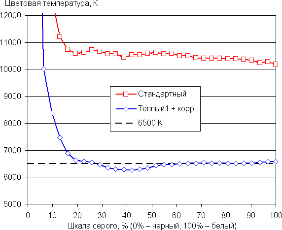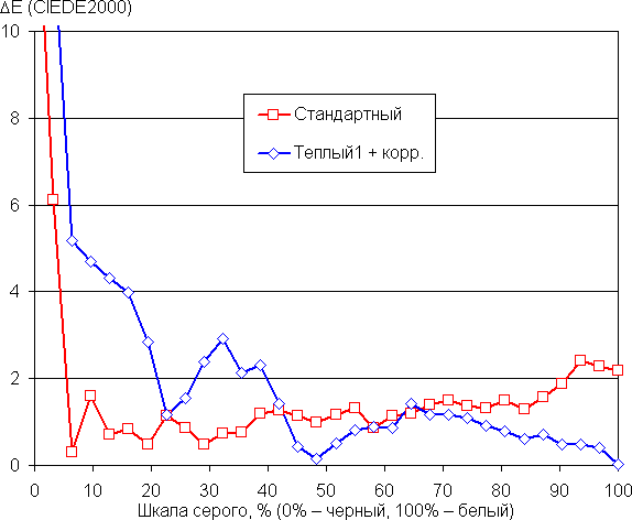 Графики ниже показывают цветовую температуру на различных участках шкалы серого и отклонение от спектра абсолютно черного тела (параметр ΔE) при выборе варианта Стандартный (самый яркий режим) для настройки Оттенок и после коррекции цветового баланса настройками усиления трех основных цветов в случае варианта Теплый1 (значения −0, −26 и −38 для усиления красного, зеленого и синего цветов):