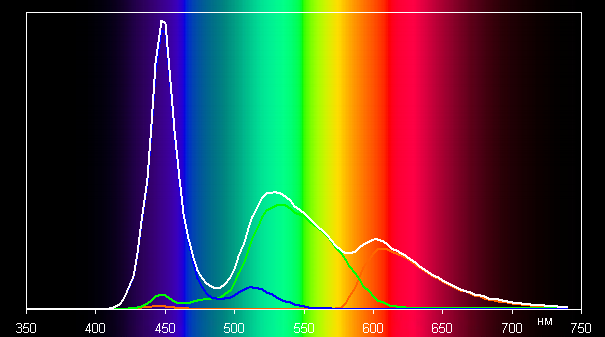 Такой спектр с относительно узким пиком синего и с широкими горбами зеленого и красного цветов характерен для мониторов, в которых используется белая светодиодная подсветка с синим излучателем и желтым люминофором. В случае режима с цветовым пространством sRGB программное перекрестное подмешивание первичных цветов друг к другу чуть-чуть увеличивается.