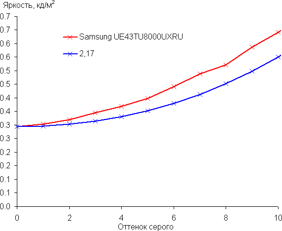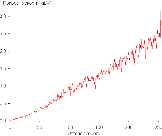 Для оценки характера роста яркости мы измерили яркость 256 оттенков серого (от 0, 0, 0 до 255, 255, 255) при подключении к ПК в режиме RGB при 3840×2160 и 60 Гц, параметр Гамма в настройках ТВ — BT.1886 = 0, Контраст = 50. График ниже показывает прирост (не абсолютное значение!) яркости между соседними полутонами: