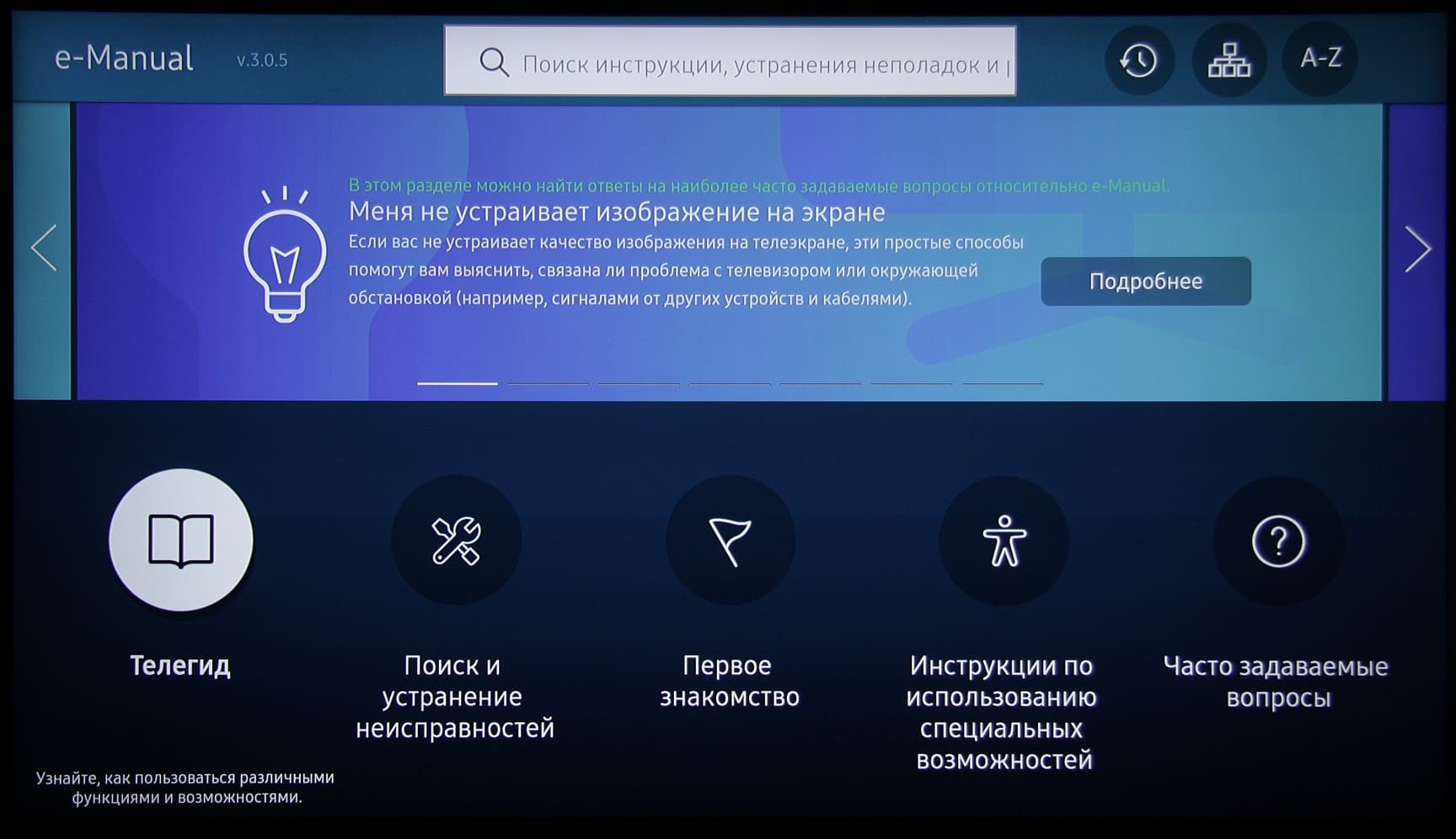 Также с сайта компании можно загрузить e-Manual в виде объемистого файла PDF. Руководство это весьма подробное (уже разрослось до 243 страниц), хотя местами не хватает информации относительно именно этой модели телевизора.