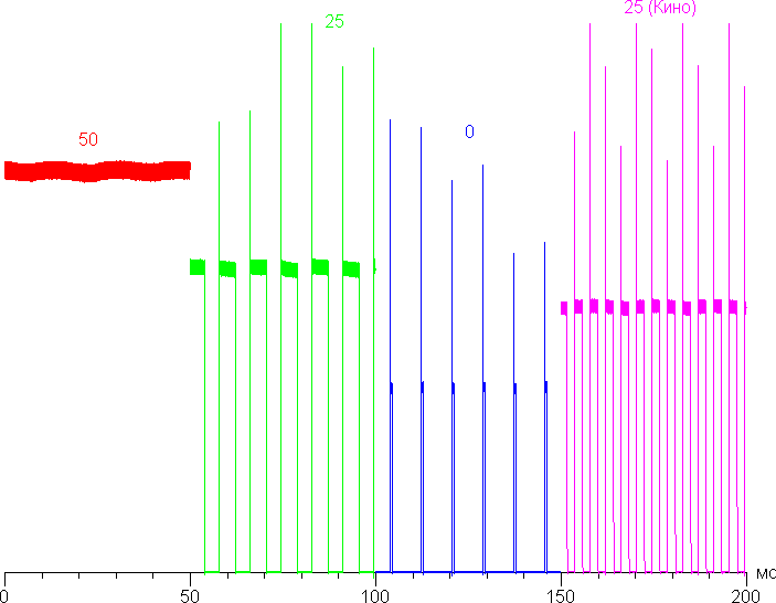 Управление яркостью свечения подсветки осуществляется с помощью ШИМ с частотой 100 ГЦ (при 50 Гц частоты обновления) или 120 Гц (при 60/24 Гц частоты обновления), но в режиме Кино с включенной функцией Настройки четкости изображения (все ее параметры можно выключить) частота ШИМ увеличивается в два раза. Ниже приведена зависимость яркости от времени, числа — это значения настройки Яркость (частота обновления 60 Гц):
