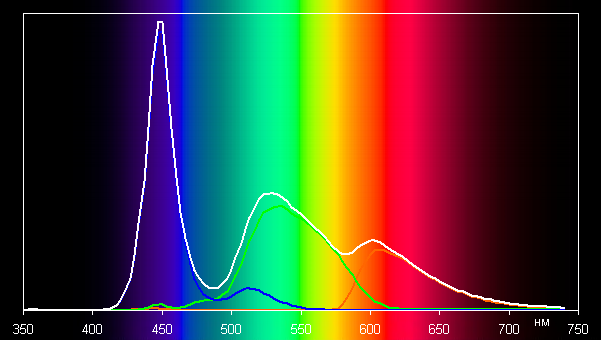 Ниже приведен спектр для белого поля (белая линия), наложенный на спектры красного, зеленого и синего полей (линии соответствующих цветов) для профиля Исходный: