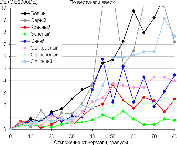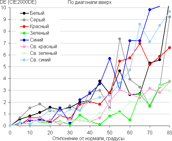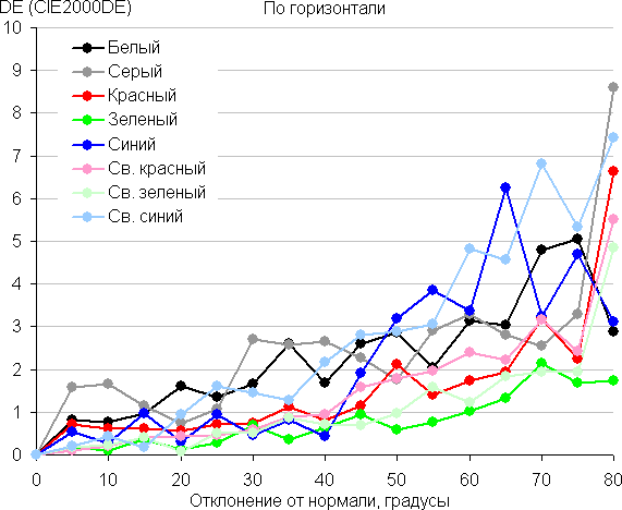 Для количественной характеристики изменения цветопередачи мы провели колориметрические измерения для белого, серого (127, 127, 127), красного, зеленого и синего, а также светло-красного, светло-зеленого и светло-синего полей во весь экран с использованием установки, подобной той, что применялась в предыдущем тесте. Измерения проводились в диапазоне углов от 0° (датчик направлен перпендикулярно к экрану) до 80° с шагом в 5°. Полученные значения интенсивностей были пересчитаны в отклонение ΔE относительно замера каждого поля при перпендикулярном положении датчика относительно экрана. Результаты представлены ниже: