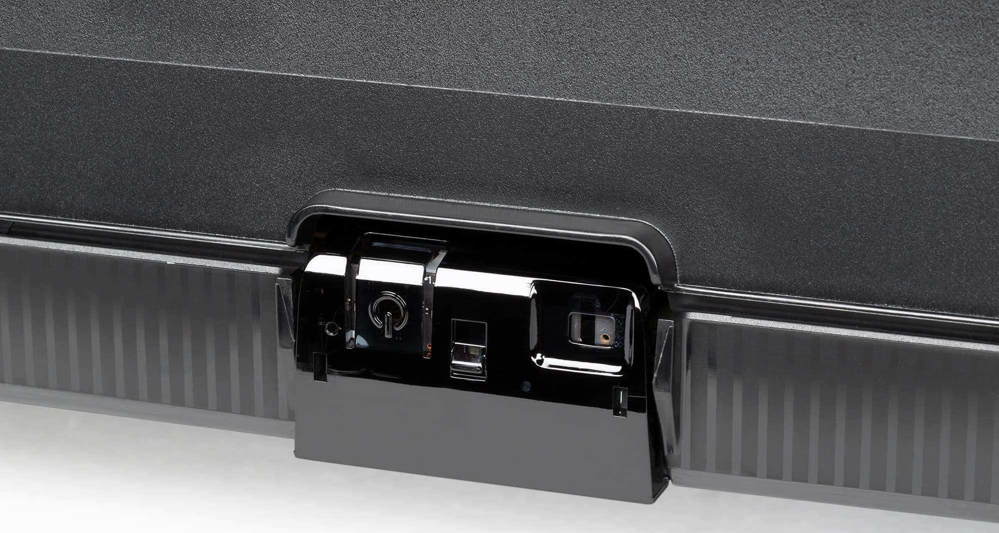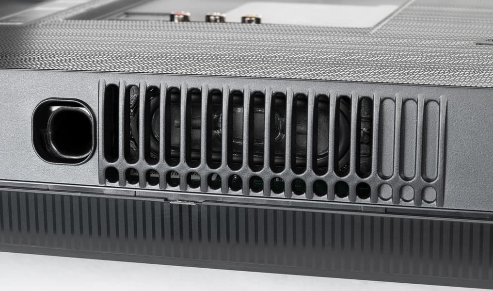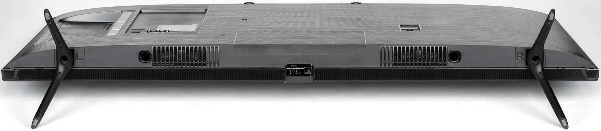 Телевизор имеет полностью пассивное охлаждение. За решетками на нижнем торце расположены встроенные громкоговорители с вытянутыми диффузорами. Рядом с ними находится по отверстию фазоинвертора.